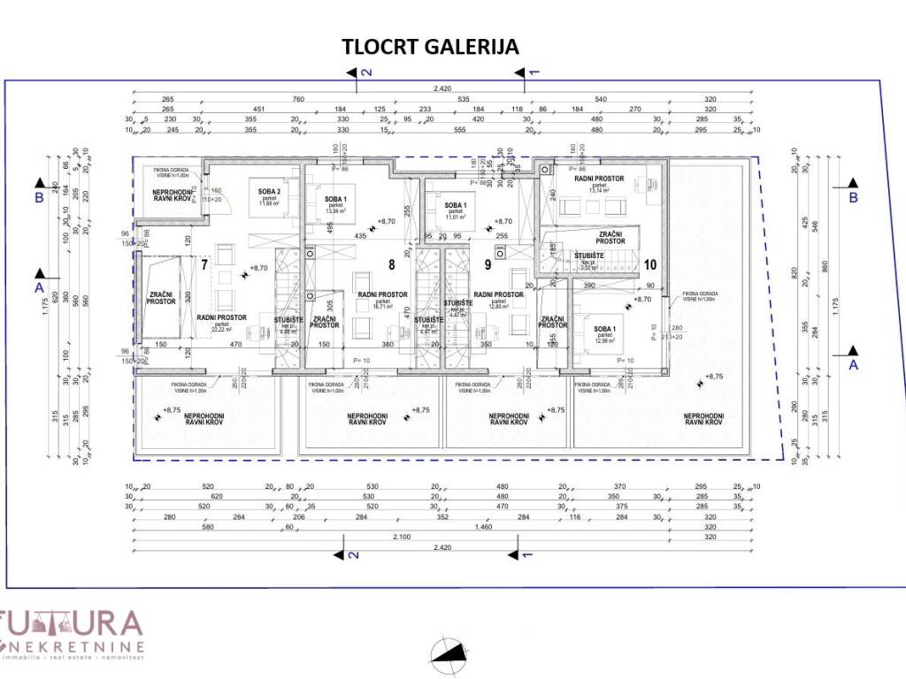 - gornja: dvije spavaće sobe, hodnik i terasa.