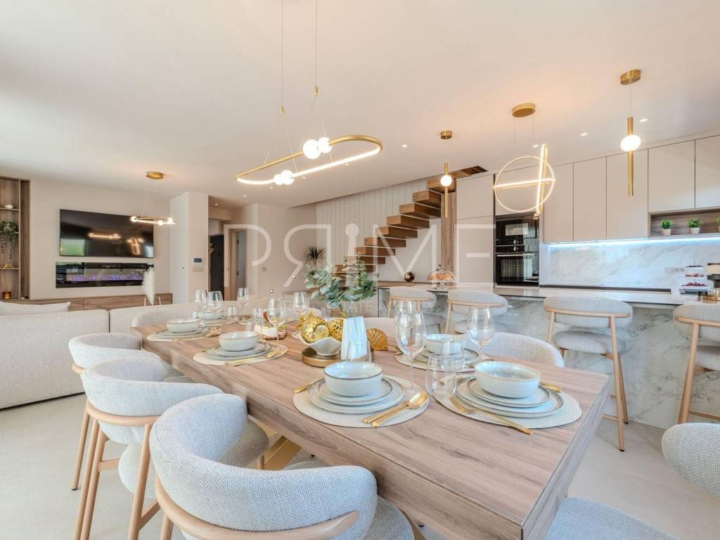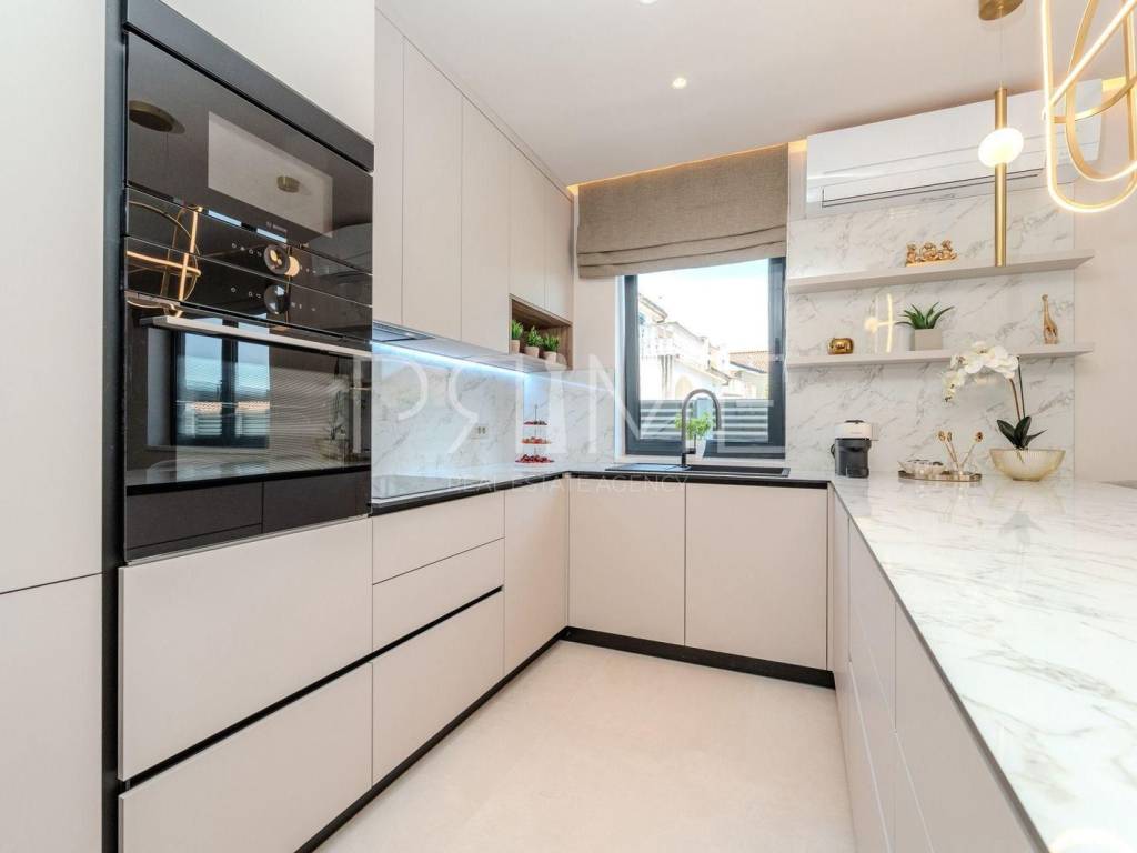 U prizemlju vile nalazi se prostrani open-space dnevni boravak s kuhinjom i blagovaonicom, moderna spavaća soba s vlastitom kupaonicom i toaletom te tehnička prostorija. Iz dnevnog dijela izlazi se na prekrasno uređenu okućnicu s mediteranskim vrtom, pergolom, roštiljem i velikim bazenom dimenzija 9 x 6 m sa sustavom elektrolize i prostorom za sunčanje.Unutarnje stubište elegantnog dizajna vodi na prvi kat gdje se nalaze tri prostrane spavaće sobe, svaka s vlastitom en-suite kupaonicom i toaletom, te izlazima na natkrivene balkone s pogledom na more. Na istom katu smješten je i vešeraj.Na drugom katu nalazi se toalet, lounge prostorija za opuštanje te luksuzna wellness zona koja uključuje infracrvenu saunu, hidromasažnu kadu (jacuzzi), tuš i izlaz na prostranu krovnu terasu/sunčalište s impresivnim pogledom na more i zalazak sunca.
