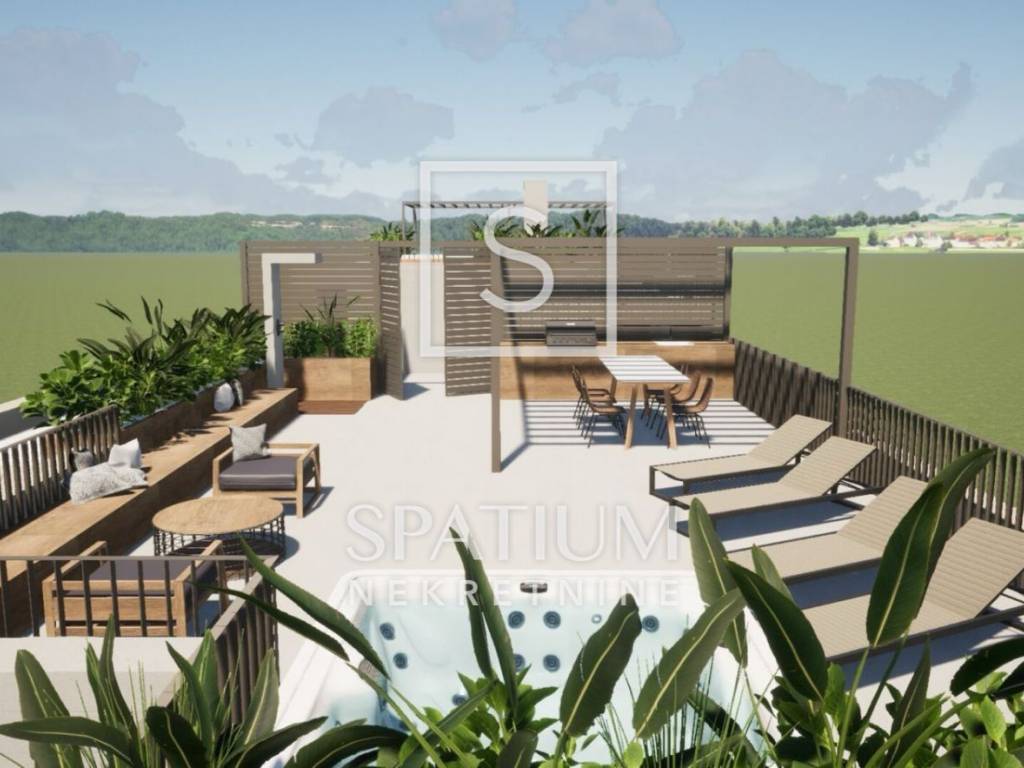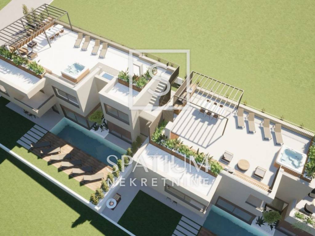 Teren je pravokutnog oblika ukupne površine 1046m2. Nalazi se u mirnom dijelu u okruženju modernih novogradnji na 2km od mora.