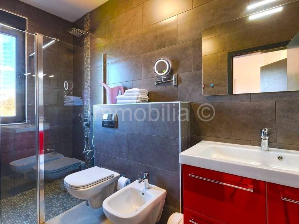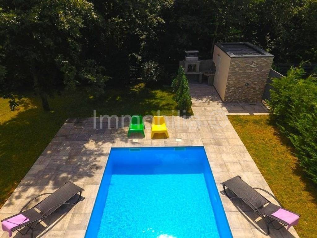 Vila je modernog dizajna, kompletno opremljena i namještena, klimatizirana , grijanje putem peći na pelete , alarm..