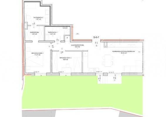 Stan S-0-7 smješten je u prizemlju i savršen je za one koji traže prostran dom s dodatnim vanjskim prostorom, poput kućnog vrta i lođe. Svojom izdašnom kvadraturom i pažljivo osmišljenim rasporedom, ovaj stan pruža maksimalnu udobnost i privatnost.