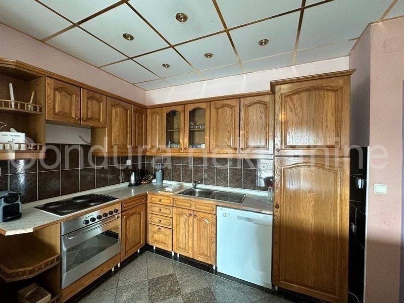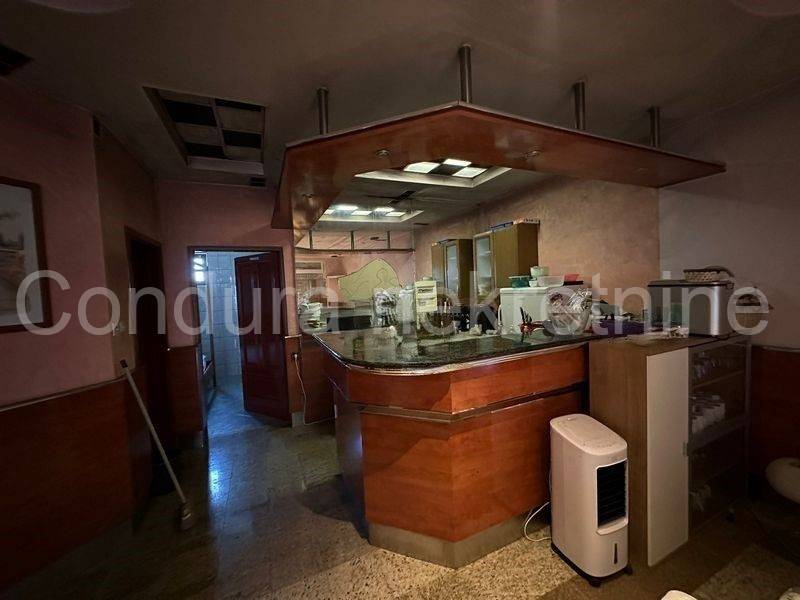 On the ground floor there is a business area (restaurant) with a bar, sanitary facilities and a closed terrace. At the back of the building there is a garage and a partially renovated apartment with two bedrooms, a bathroom and a spacious living room with a kitchen.