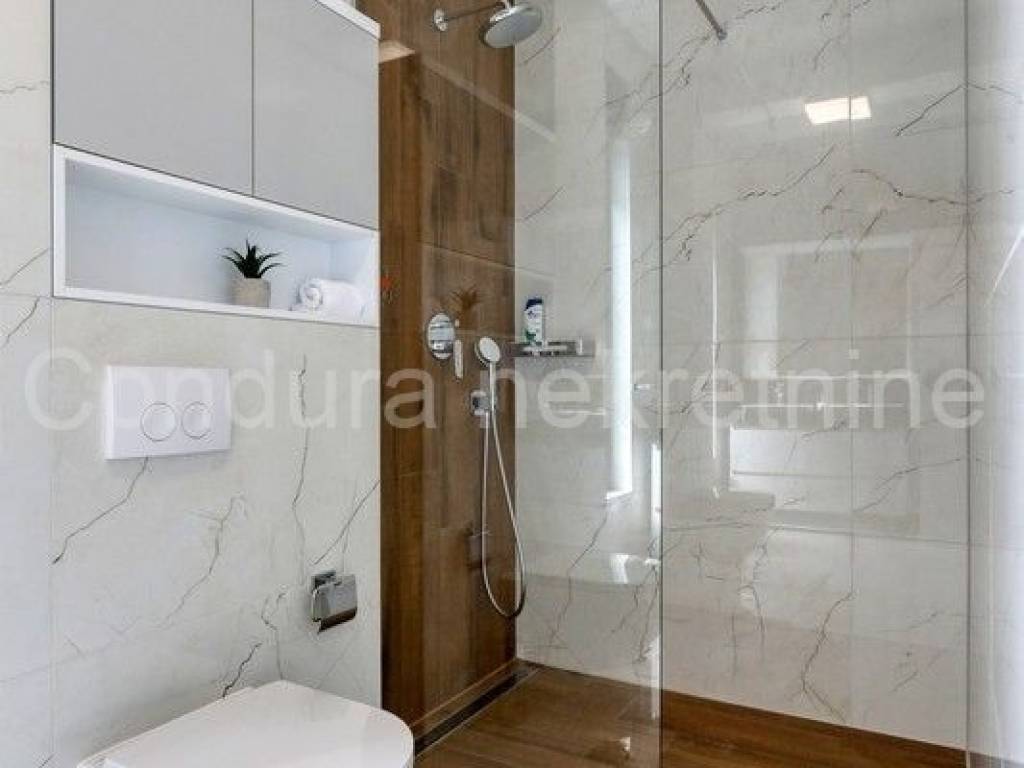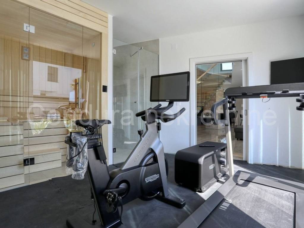 The ground floor offers a functional layout that includes a kitchen with a dining room and a living room, a toilet, a storage room, a boiler room/laundry room and a luxurious wellness area equipped with a sauna and a gym, providing additional comfort during your stay. Large glass walls from the living room and dining room open onto a covered terrace with barbecue, next to which there is a heated swimming pool with counter-current swimming. There is also an outdoor shower in the immediate vicinity of the pool.