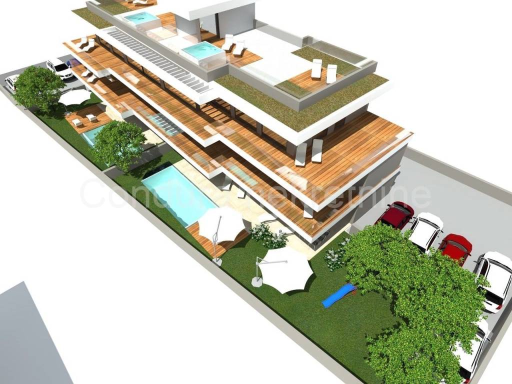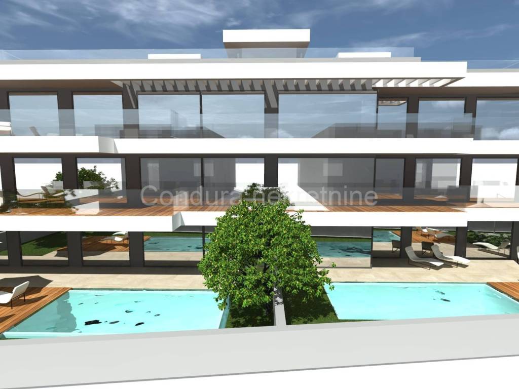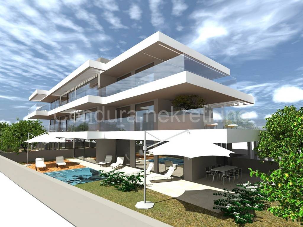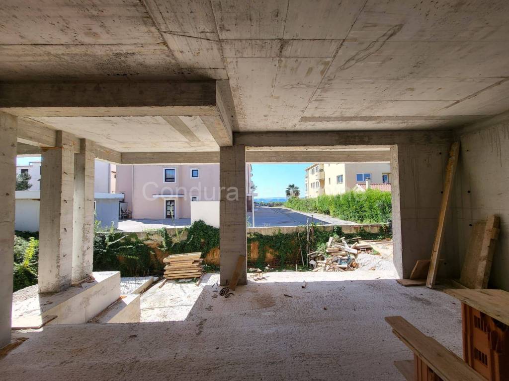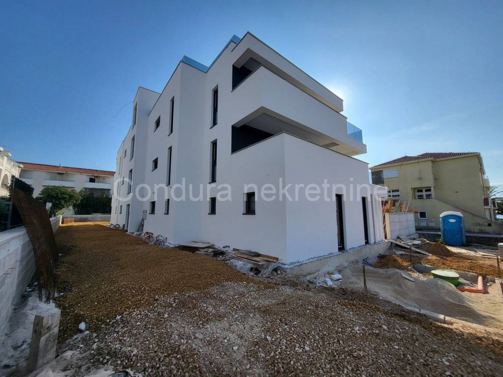 An apartment for sale on the ground floor of a building with a total of six residential units, only 60 m from the sea and the first beach. The apartment has area of 133,42 m2 and consists of two bedrooms, two bathrooms, a kitchen with a dining room and a large living room, and a spacious partially covered large terrace.It also has two parking spaces and a ca.15 m2 garden where is the swimming pool. Top quality new construction:- facade 10 cm styrofoam- joineryRehau 7 chambers with large sliding walls with mosquito nets and electric blinds- floor heating with wifi thermostat in bathrooms and living room- Villeroy & Boch and Hansgrohe sanitary ware- air conditioning in every room- swimming pool23,80 m2 In the immediate vicinity of the apartment there is a shop, restaurant and other similar facilities. The end of construction is planned for 5/2025