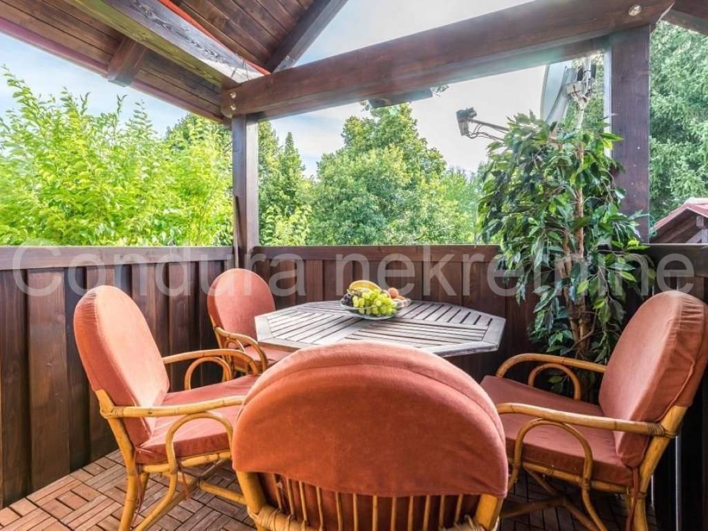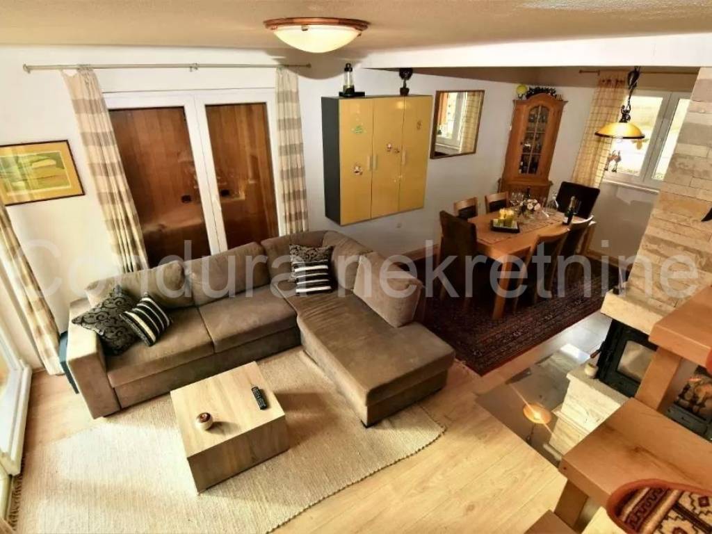 The larger house, approx. 110 m2, consists of a ground floor with an entrance area, a spacious living room with a dining room and kitchen, a bathroom, a storage room and an uncovered terrace. The entire space is dominated by wood, and in the living room, a special atmosphere is created in winter by a wood-burning fireplace and a large glass wall through which a beautiful view of the untouched nature extends. A wooden staircase leads from the living area to the attic, where there are two bedrooms, a bathroom and a gallery. Both bedrooms have access to a covered wooden terrace with an idyllic view of the Velebit mountain and a spacious garden.