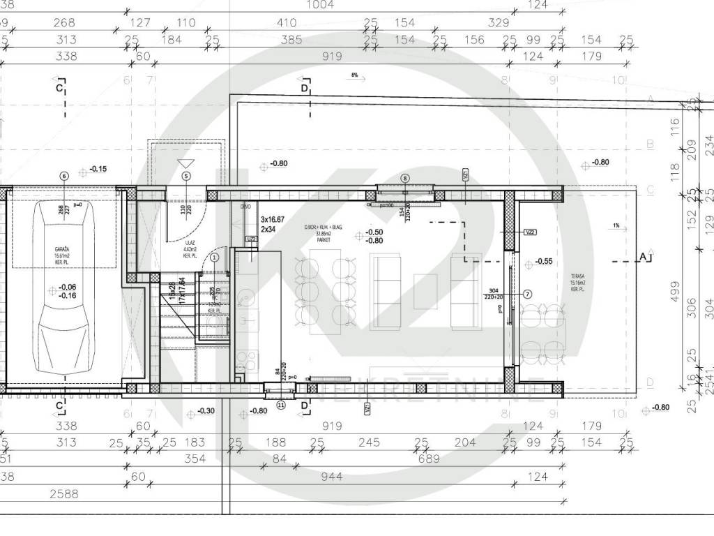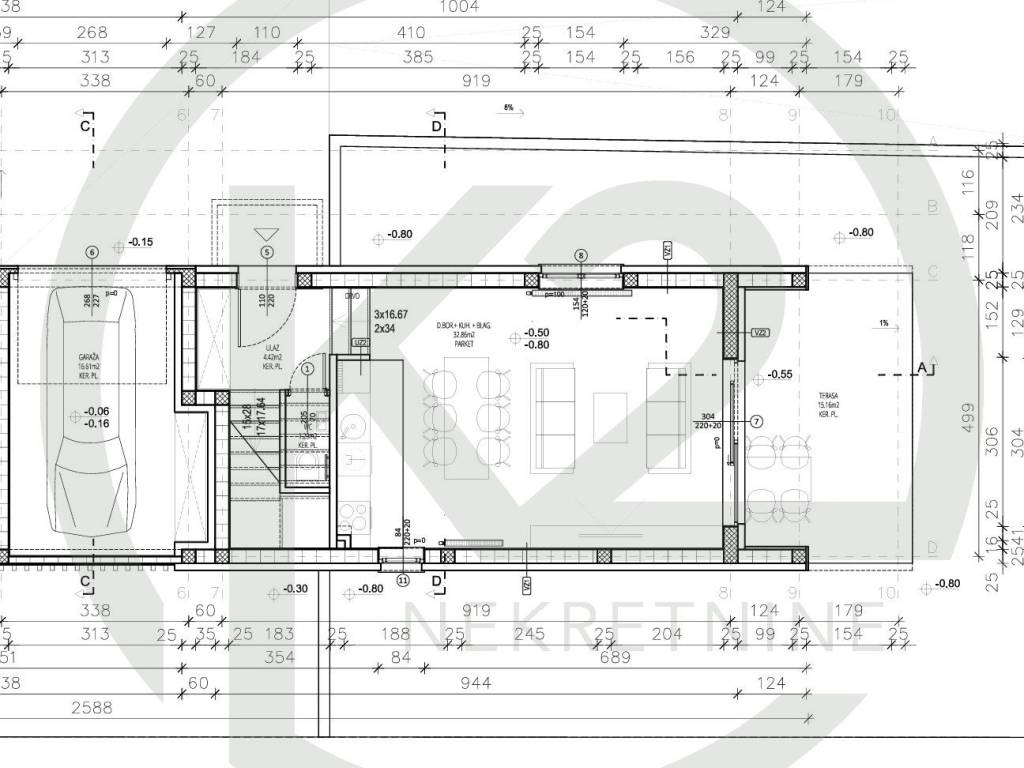 Podovi kupaonice, WC-a i kuhinje i ulazni prostor će biti obloženi keramičkim poločicama I. klase. Podovi terasa protukliznom keramikom također I. klase.