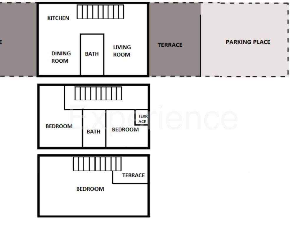 Ground floor: entrance hall, kitchen and dining room with access to a spacious covered terrace, living room and bathroom,