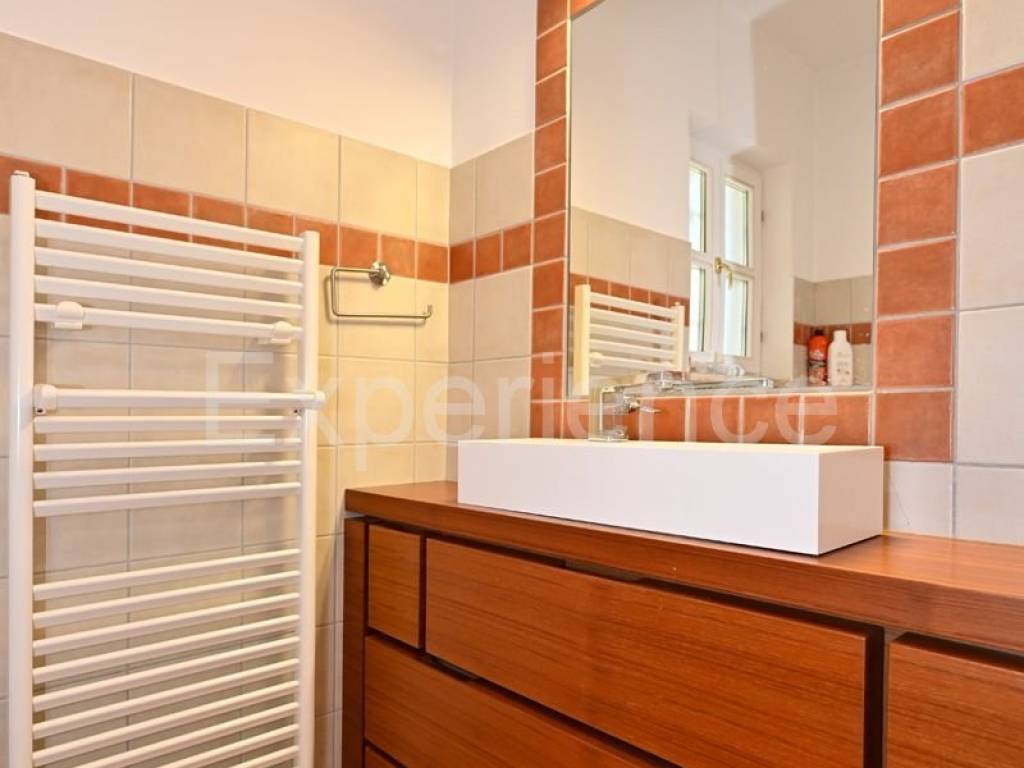 The terrace is connected to the garden by an external staircase. The garden is beautifully landscaped with Mediterranean plants, an old olive tree, landscaped lawn, and a 30 m swimming pool.