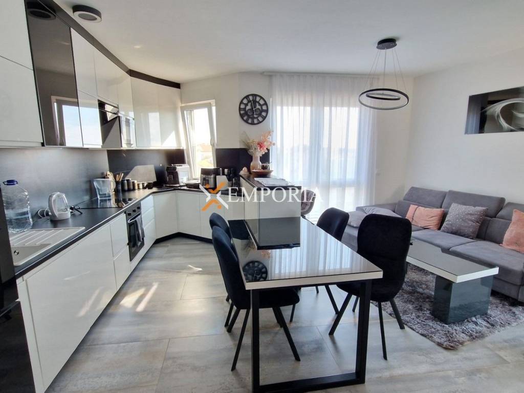 Fully furnished penthouse apartment in Plovanija for sale. It is a modern new building.This is an apartment on the 2nd floor of a residential building. The layout of the rooms consists of a hallway, two bedrooms, a bathroom, a kitchen with a dining room and living room, and a loggia. The staircase leads to the roof terrace of 136,43 m2. The net usable area of ​​the described premises is 114,44 m2.The apartment also has two parking spaces in front of the building.The total net area of ​​the apartment with additional parts is 119,94 m2.The distance of this property from the sea is 1.5 km. The distance from the center is 1.9 km.