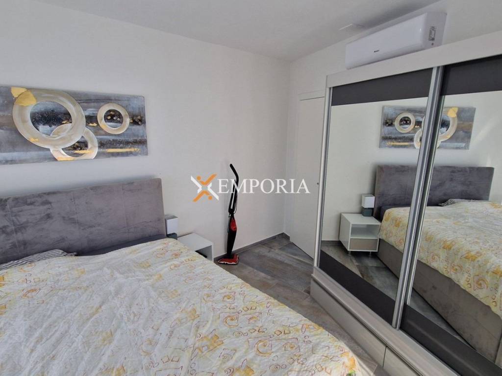 The apartment is for sale fully furnished and equipped.The construction of the building was made with a concrete wall and brick thermal block. Thermal insulation of the facade is 10 cm Styrofoam. The windows are made of PVC material with three-layer glass, electric shutters and mosquito nets. The floor coverings are tiles. Air conditioners are installed in the living room and in the bedrooms. In addition, the entire apartment has underfloor heating through a heat pump. Furthermore, the entrance door of the apartment is burglar-proof and fire-proof.This property has an excellent A+ energy certificate!