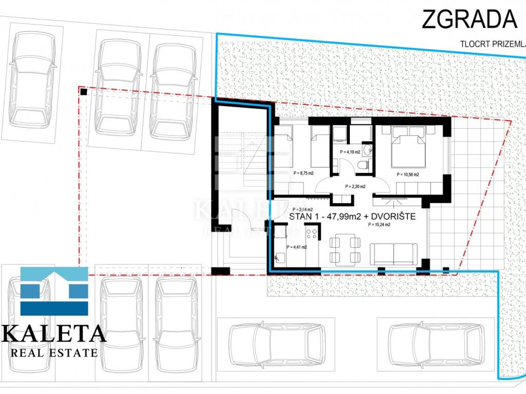 The apartment has a living area of 47.99 m² + approx. 100 m² garden + 2 parking spaces, located on the ground floor of a high-quality building with a total of 4 apartments.
