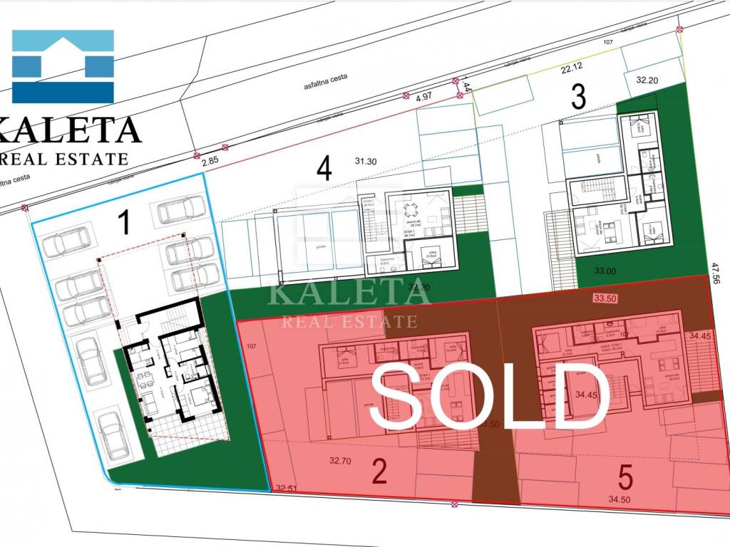 The project consists of 5 buildings, each with 4 apartments, and every apartment includes 2 parking spaces.