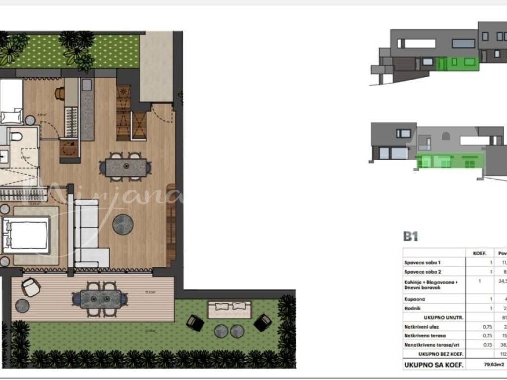 Stan B1- nalazi se u prizemlju, natkriveni ulaz (2.33m2), zatvorenog stambenog prostora ima 61 m2, i čine ga: 2 spavaće sobe, kupaona te dnevni dio otvorenog koncepta ( 34.58 m2) iz kojeg se izlazi na natkrivenu terasu 15.22 m2 te nenatkriveni dio terase i vrt ( 36.40 m2).