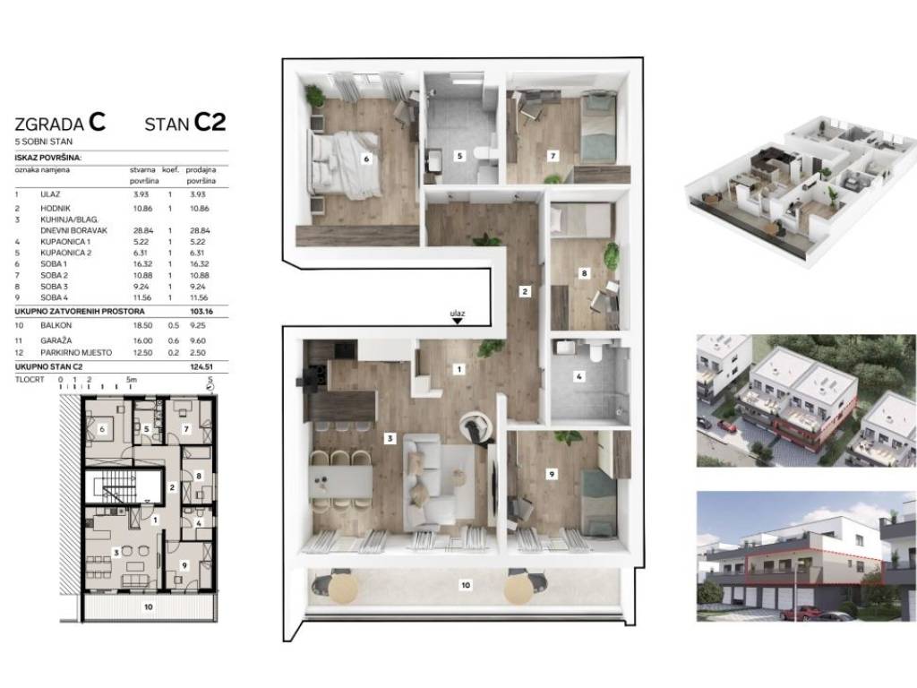 Petorosoban stan oznake C-2 na 1.katu zgrade sa 3 stana, u izgradnji, u naselju Rakarje, pored Velike Gorice. Sastoji se od: ulaznog hodnika dnevnog boravka s kuhinjom i blagovaonicom, 4 spavaće sobe, hodnika, 2 kupaonice, balkona, garaže i vanjskog parkirnog mjesta. Rok useljenja je 06.2025.g. Zgrada se gradi od termo blok opeke 25 cm sa armirano-betonskom kontrukcijom, a pregradni zidovi od cigle. Zgrada će biti biti obložena kamenom vunom, debljine 10 cm, a predviđen energetski razred je "A". Svi stanovi imat će svoje vlastite priključke, a grijanje je podno na plin. Podovi dnevnog boravka, kupaone i kuhinje bit će obloženi kvalitetnom keramikom po želji kupca, dok će u sobama biti ugrađen parket. Stolarija je PVC - Komerling MD 76, troslojna, u antracit boji sa aluminijskim roletama. Stubište zgrade bit će obloženo kamenom, stubišna ograda od inoxa, a na stropu bit će ugrađen svjetlarnik.