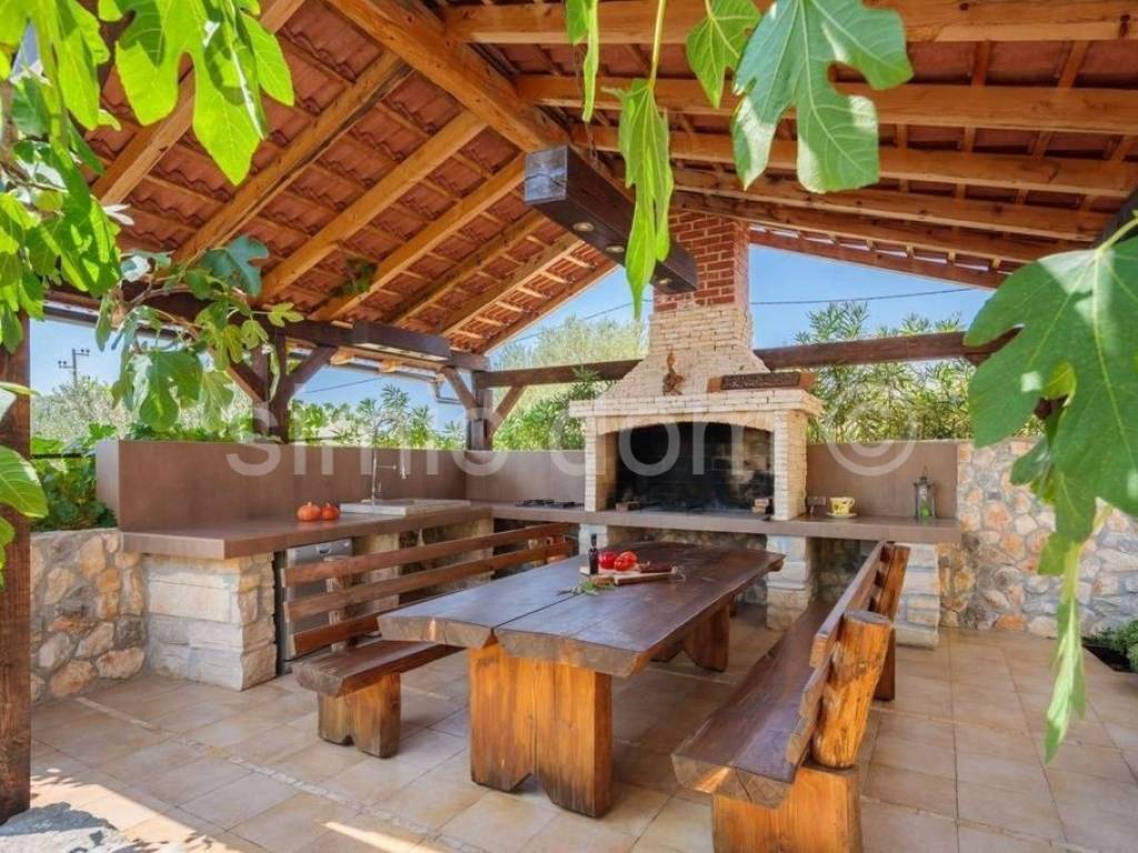 A beautifully decorated property for sale in the Marina area, ideal for a holiday in a peaceful Dalmatian atmosphere. The residential part of the property has a total area of about 360 m2 and is built on a plot of land measuring 3000 m2. It consists of two units - the main house and a stone house. The pictures speak louder than words about the beautifully decorated interior, and the future buyer can enjoy a fully equipped and newly renovated modern property, full of traditional stone and wood details. The outdoor area is a real gem of this property, which contains a large heated pool, a gazebo with a fireplace, numerous beautiful and large terraces, a playground for children and a large plot of land measuring 1000 m2 surrounded by citrus trees and an olive grove. The property also includes another older residential building of 60 m2 that offers the possibility of obtaining additional living space, and there is also a spacious covered parking space. The property is being sold fully furnished.