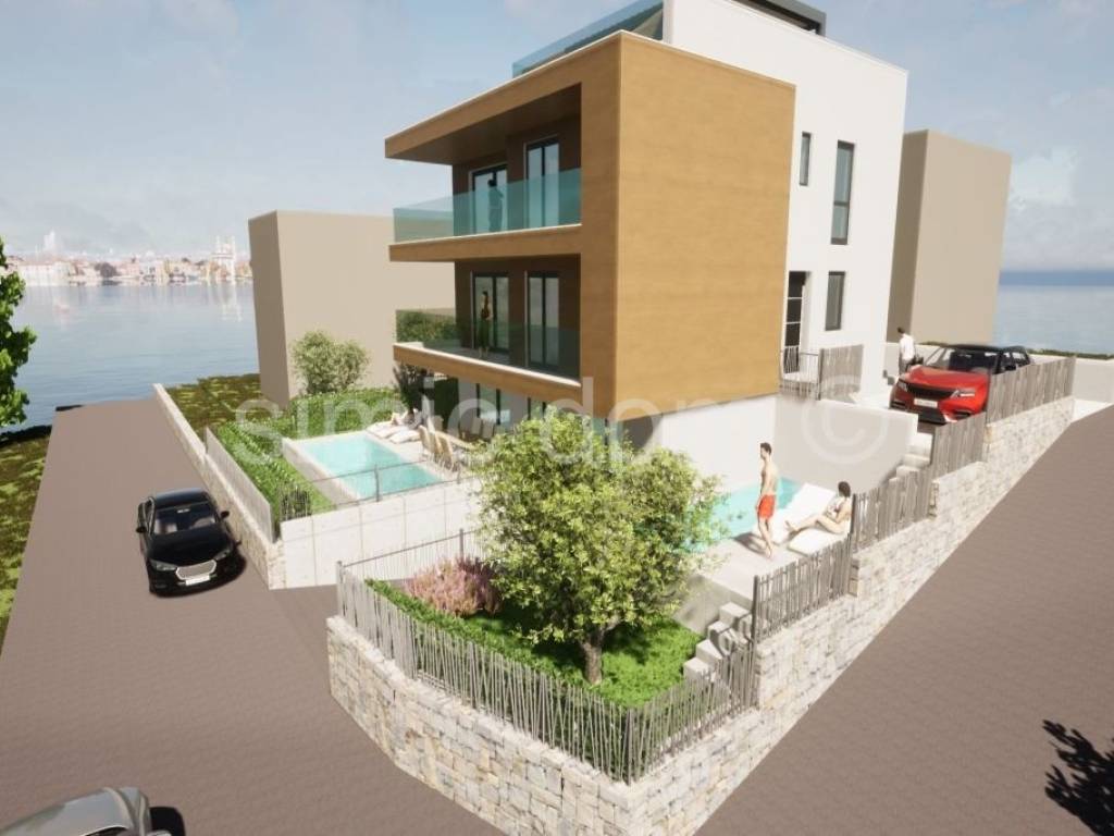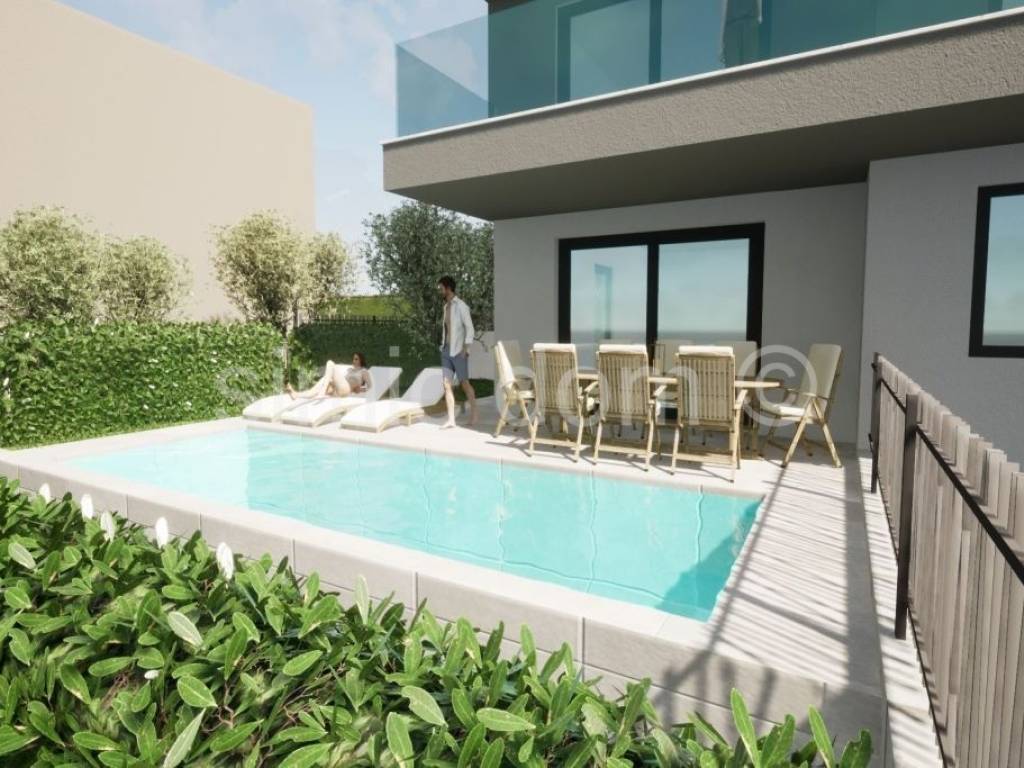 For sale is a great apartment placed on the ground floor of a new construction. The apartment is 190 m away from the sea by land and only 90 m by air, and the property itself offers an excellent view of the sea from all floors of the building, which will not be able to be hidden in the future. The apartment on the ground floor has a total area of 92 m2 and will have its own garden of over 100 m2, which will be partially paved, and its own swimming pool of 33 m2. The apartment will have 3 bedrooms, 2 bathrooms and a spacious kitchen with an open concept dining room and living room. The apartment also has one garage space included in the price. With coefficients and associated parts, the apartment has a net usable area of about 109m2. The building will be built and equipped according to high standards, exterior carpentry with mosquito nets, burglar-proof and fire-proof entrance doors, blinds with electric lifters, underfloor heating, modern bathroom fixtures. Expected occupancy is mid-2026. Due to its location close to all amenities, this property is an excellent investment both for rent and as your own vacation property.