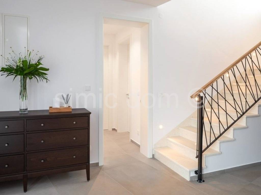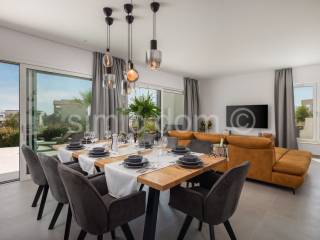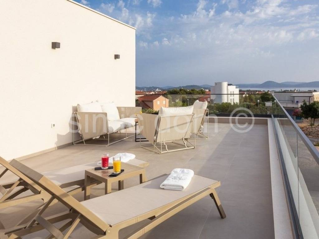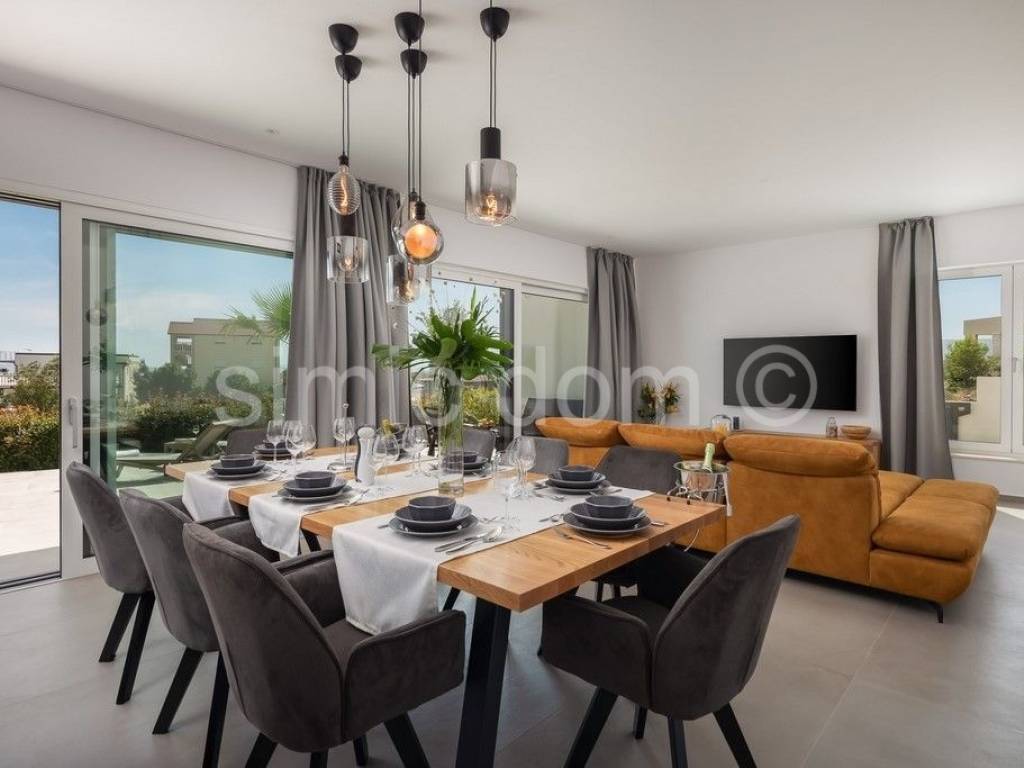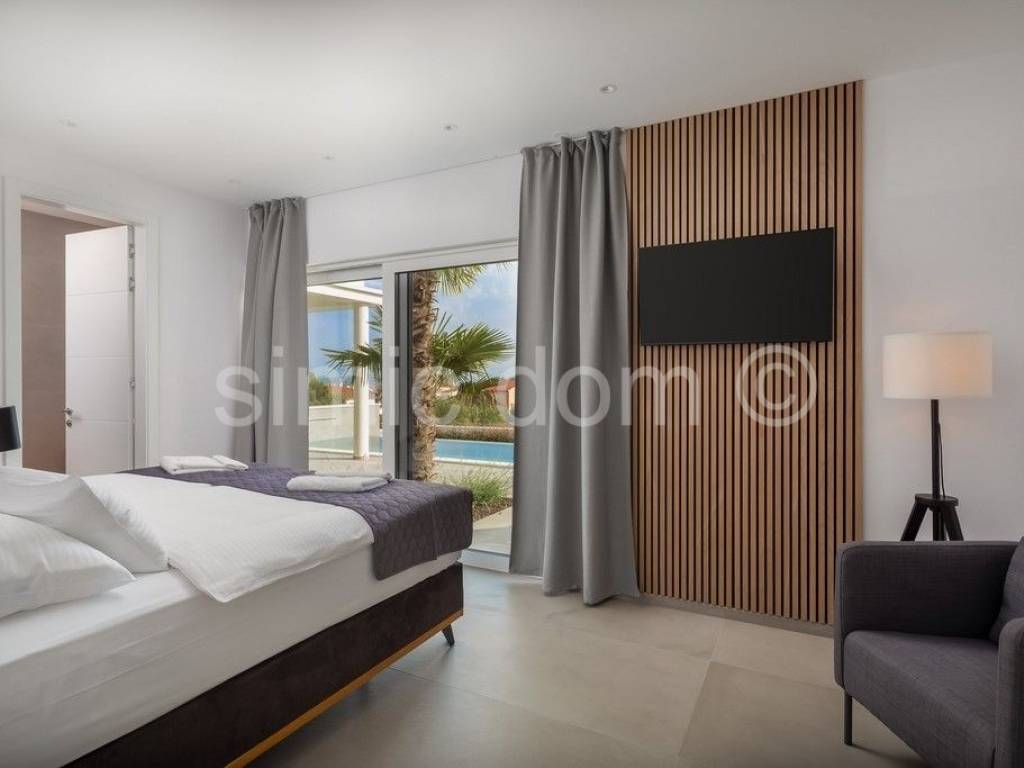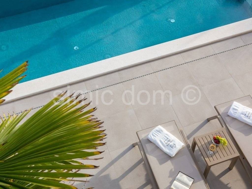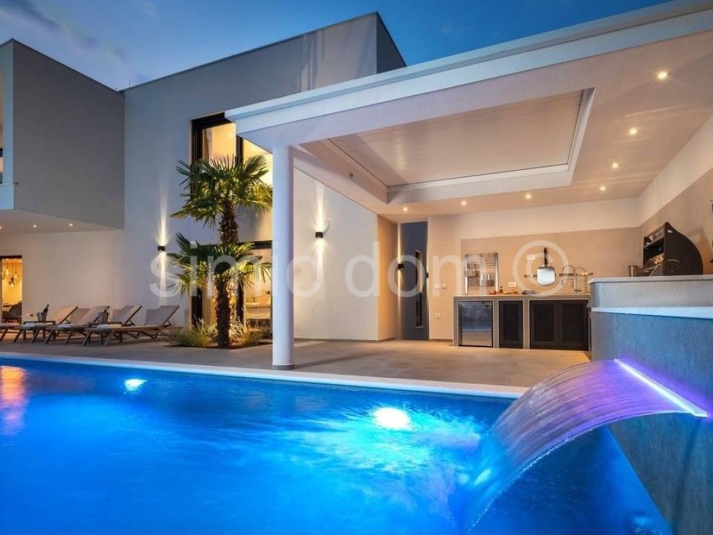 For sale is a beautiful newly-built villa located in a quiet part of Vodice. The villa is placed on a plot of over 800m2 with a wonderful view of Vodice and the sea. The villa itself consists of three floors: basement, ground floor and first floor. Total net usable area is about 320m2. This beautiful villa is decorated with a well-kept garden with an imposing swimming pool, a sundeck, a superbly equipped summer kitchen, a landscaped garden and a parking lot. There are storage rooms and a bathroom in the basement of the villa. On the ground floor of the villa there is a beautifully decorated living area (open concept kitchen with dining room and living room), two bedrooms, two bathrooms, a toilet and a garage. There are three more bedrooms with private bathrooms on the first floor. The villa is well equipped, all appliances are from Miele. The carpentry is aluminum with electric blinds. Underfloor heating connected to a heat pump and an 800-liter water heater was installed throughout the villa. The preparation for the solar cells has been set up. The villa also has a charger for electric cars. This property is full of beautiful terraces that are accessible from all rooms of the house and provide an incredible atmosphere and view of the surroundings. The villa is superbly equipped and it is being sold fully furnished. The center of Vodice is 1.2 km away and so is the beach. Other facilities such as shops and cafes are at a shorter distance. This property is ideal for buyers looking for a luxurious modern villa in a quiet area, yet superbly equipped with all the conveniences of a modern property.