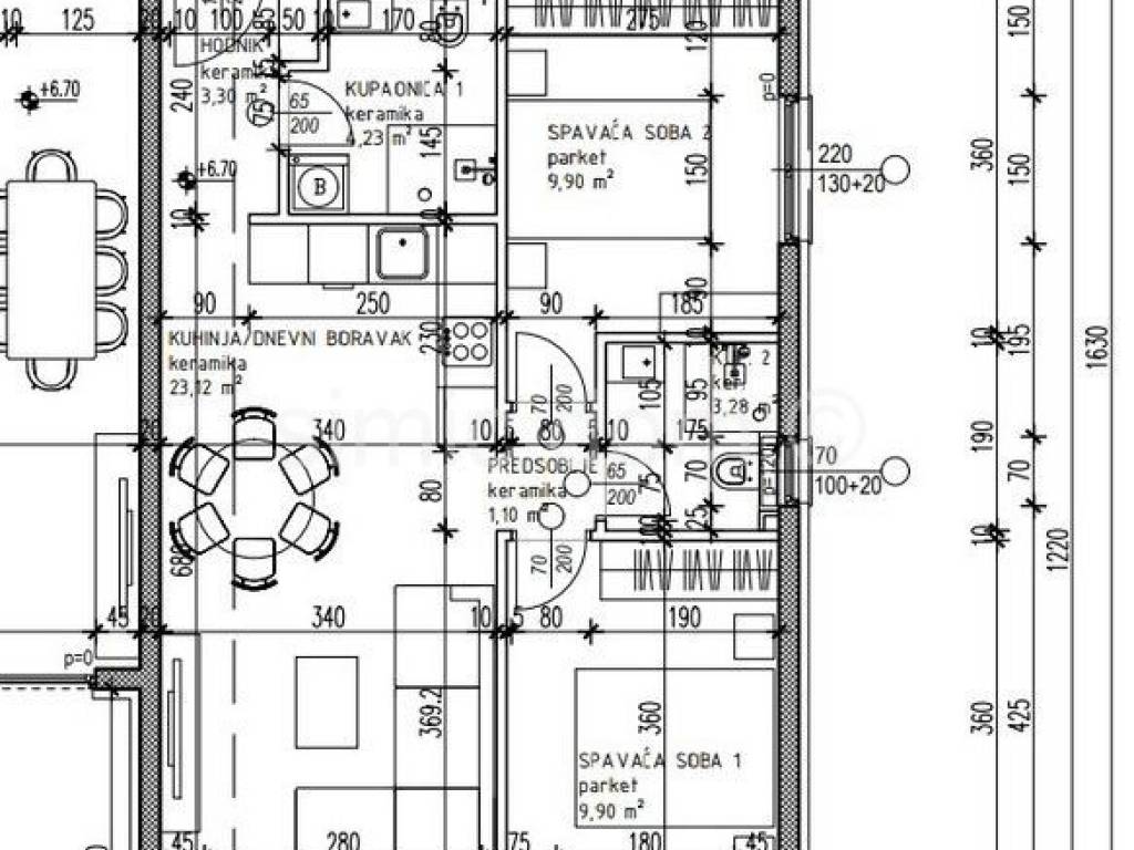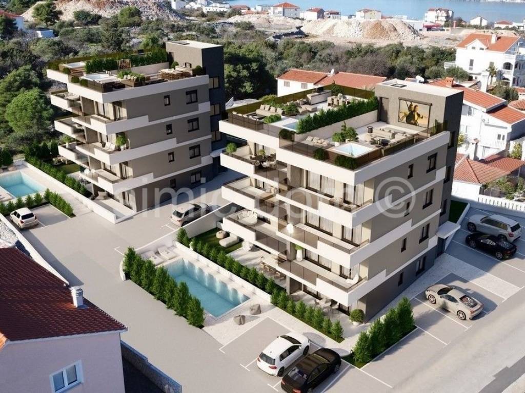 For sale is an apartment in new construction on the south side of the island of Ciovo, only 10 minutes' walk from the beach. The apartment is designated as S8 and is located on the third floor of a building with an elevator. It has a total internal area of 55.46m2, a balcony of 14.62m2 and a roof terrace of 70m2 floor area. From the roof terrace there is a spectacular panoramic view of the sea and the entire Okrug Gornji. The total net area of the apartment is 80.37m2. It consists of two bedrooms, two bathrooms and a kitchen with a living room and a dining room, which leads to a spacious balcony. The apartment includes a private parking spot. The building has a 28m2 swimming pool that can be used by all owners. The building will be of high quality, with 10 cm thermal insulation. Each apartment will have underfloor heating and air conditioning. Construction began in February 2024, and occupancy is expected in May 2025.