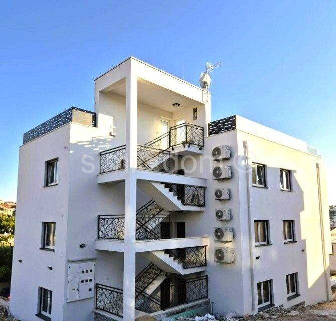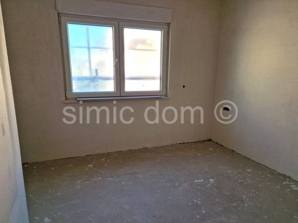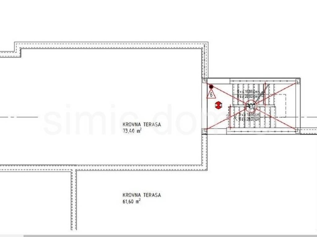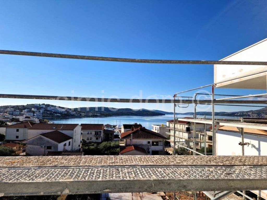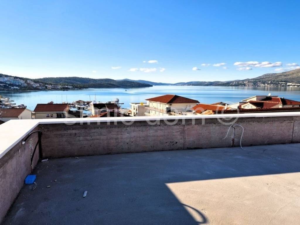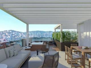 For sale are penthouse apartments located in a prime location on Ciovo, in the very center of Okrug Gornji. The apartments are placed on the second floor, in a smaller building with a total of 6 residential units. From here you have just a two-minute walk to the main beach, and all other amenities are also located in the immediate vicinity. The apartments are labeled S5 and S6 and have a similar layout. They consist of a hallway, one bathroom, two bedrooms and a spacious living room with kitchen and dining room. From this living space you have access to a balcony that offers a beautiful view, while the larger apartment (S5) also has a storage room, which is a great advantage. Each apartment also has a roof terrace with a superb panoramic view of the sea and the surrounding area. Apartment S5 has a total floor area of 73m2 and another 73.50m2 of roof terrace, i.e. with coefficients it has an area of 84.56m2 and its price is 410,000. Apartment S6 has a total floor area of 61m2 and another 62m2 of roof terrace, i.e. with coefficients it has an area of 72.24m2 and its price is 350,000. Each apartment has one outdoor parking space included in the price. The apartments will be equipped with air conditioning, underfloor heating and top-quality sanitary facilities, and they will also have the use of a swimming pool. The completion of the works is the spring of 2025.