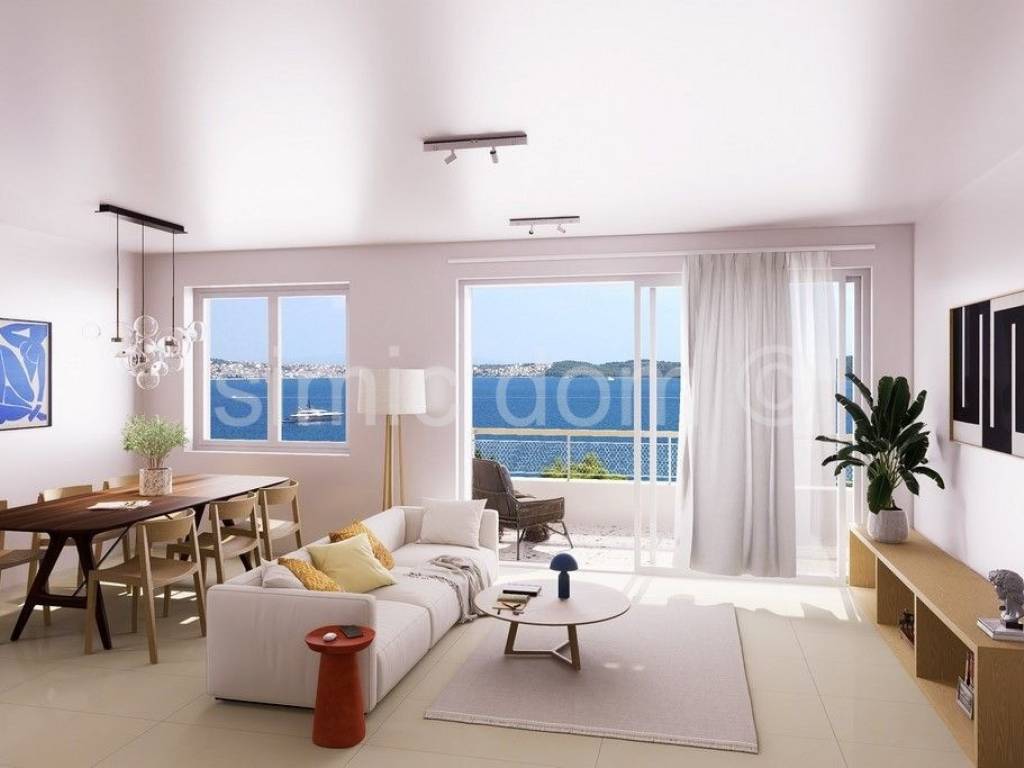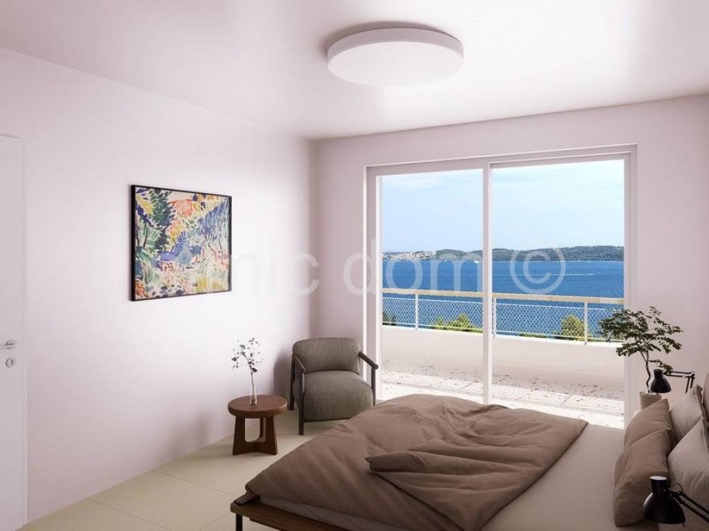 We are mediating the sale of a beautiful, sunny and very bright penthouse apartment located approximately 100m from the sea. The area of the apartment is 105m2, and it offers two bedrooms with their own bathrooms, an additional bathroom for guests, an entrance hall, an impressive living room with a kitchen and dining room and two terraces (one oriented to the south, the other to the east) covered with pergolas. These terraces offer a beautiful view of the sea, Trogir and nearby islands. Since construction is in an advanced stage, completion is expected by the end of 2024, and the investor is a legal entity. The high quality of construction in terms of top-quality materials, ceramics, carpentry and sanitary ware, as well as excellent equipment upon completion of construction (heat pumps, underfloor heating, air conditioning in all rooms, elevator), are a guarantee of an excellent investment. The purchase of a garage parking space of 25,000 is also mandatory. Beautiful view, the proximity of Trogir and the quality of the construction make this property an excellent choice for living or renting. Ownership in order.