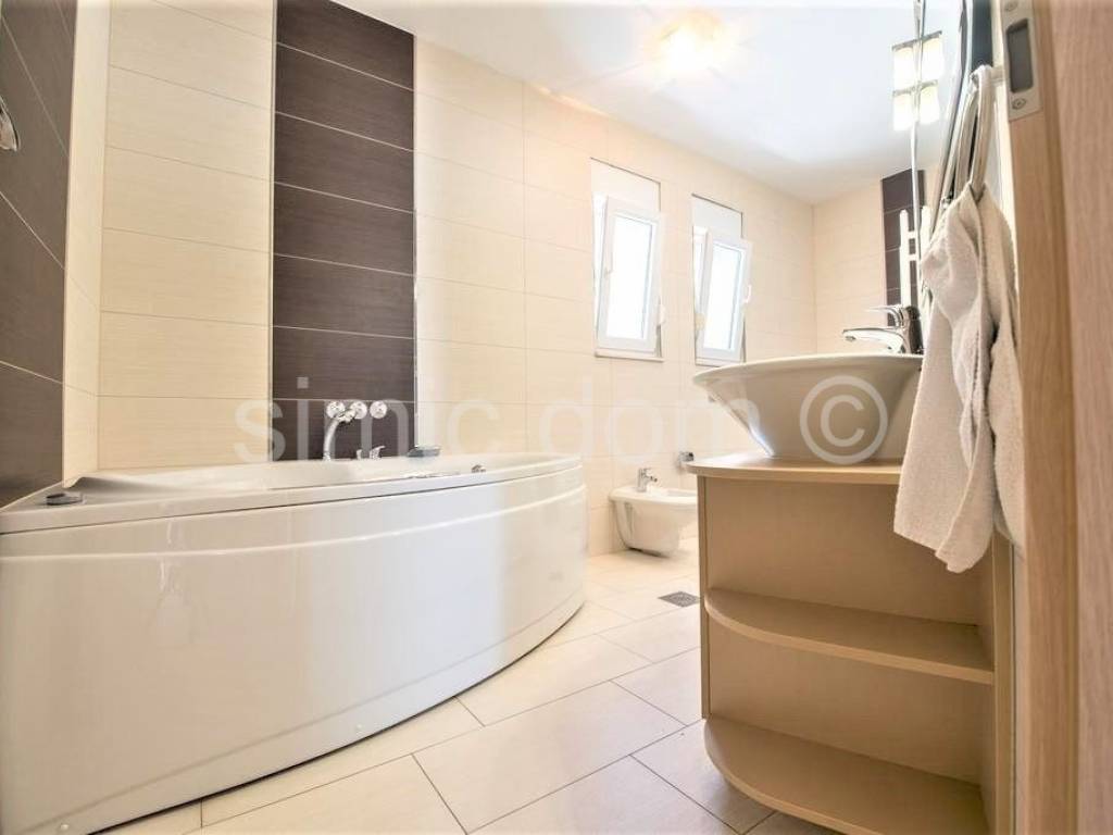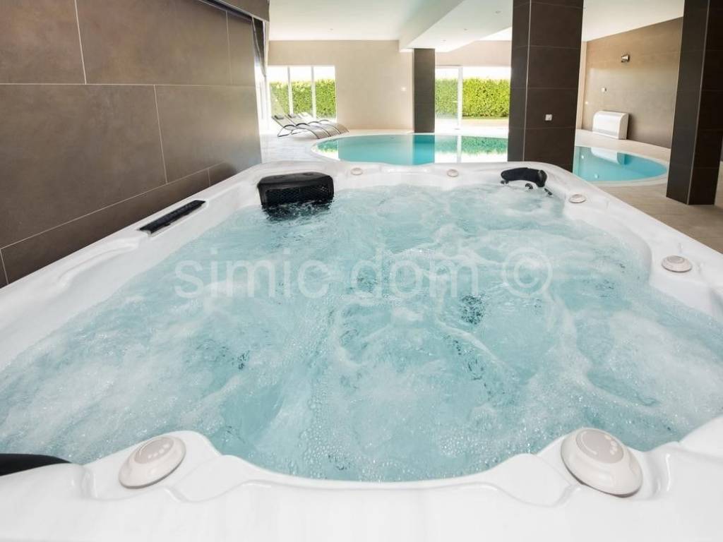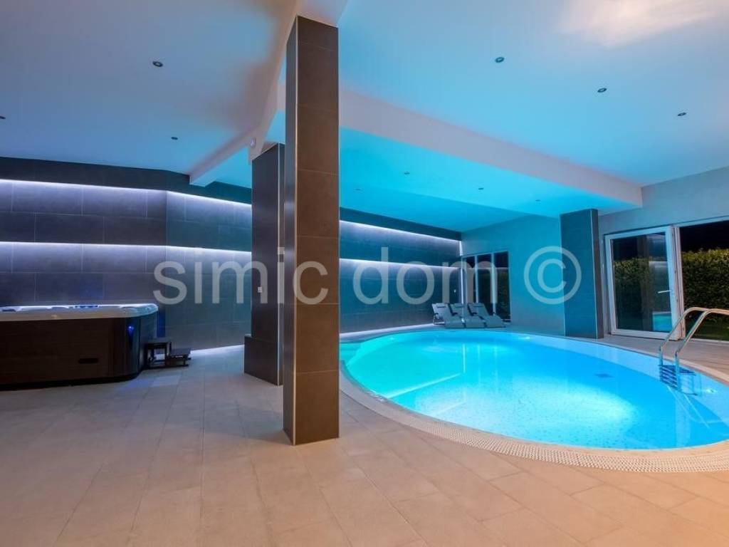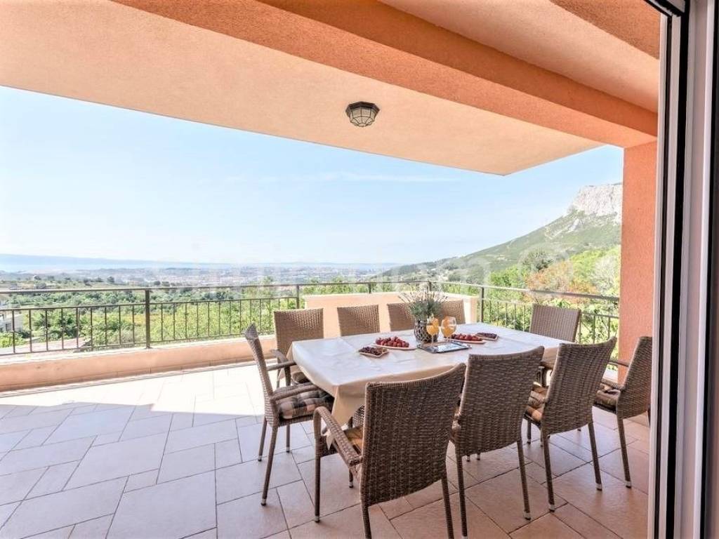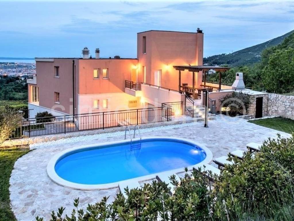For sale is a spacious villa with two swimming pools, located near Split and with a beautiful view of the sea and the entire surrounding area. The villa has a surface of 450 m2 and consists of 4 floors - basement, souterrain, ground floor and the first floor. The house contains a total of 5 bedrooms and 4 bathrooms. Special mention should be made of the richly equipped ground floor level featuring a heated pool, a sauna for 5 people, a summer kitchen with barbecue, an outdoor pool of 24 m2, with a beautiful cultivated garden offering unforgettable views. The house is being sold fully furnished, equipped and air-conditioned. It is ideal for a tranquil and relaxing vacation in peace and quiet, and at the same time you are close to Solin, Split and all the necessary facilities. It is possible to upgrade another floor. Ownership in order.