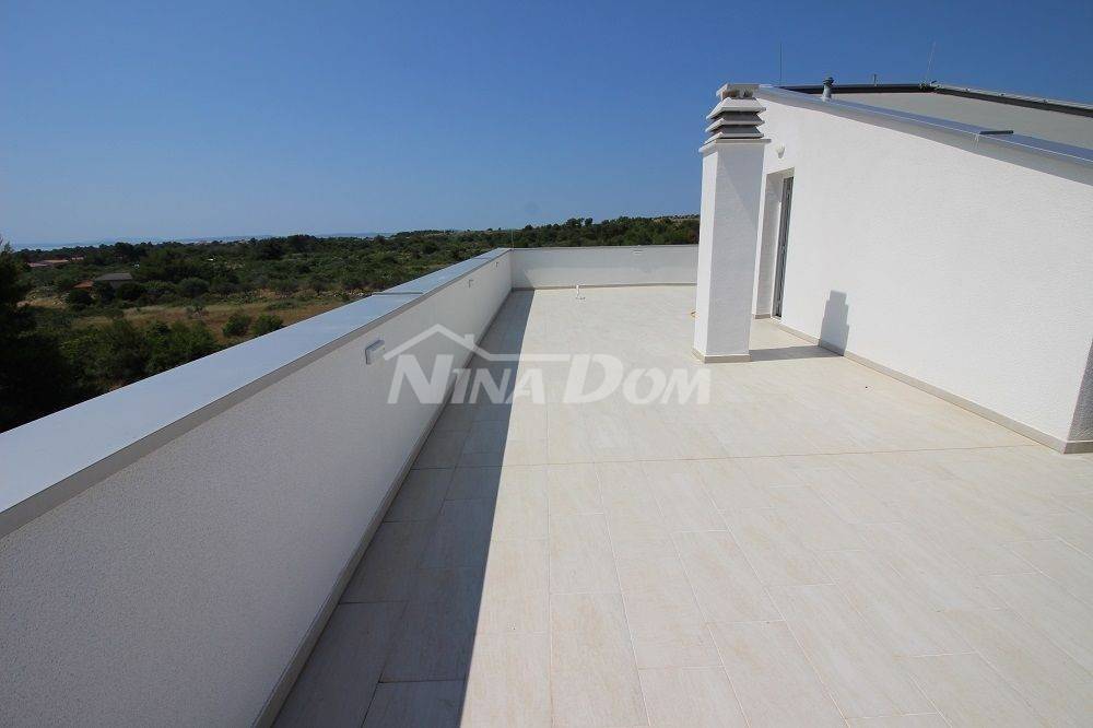 Apartment, new building on the south side of the island of Vir.Located in a quiet part of a one-way street in the immediate vicinity of the center of the island of Vir, 800 meters from the main beach Jadro.is located on the second floor of the building and consists of a hallway, two bedrooms, one of which has its own balcony, bathroom, kitchen with living room and dining room, covered terrace.The apartment also has a roof terrace with a beautiful panoramic view of the sea, and two parking spaces.air conditioning (bedrooms and living room) underfloor heating in all except the bedrooms.
