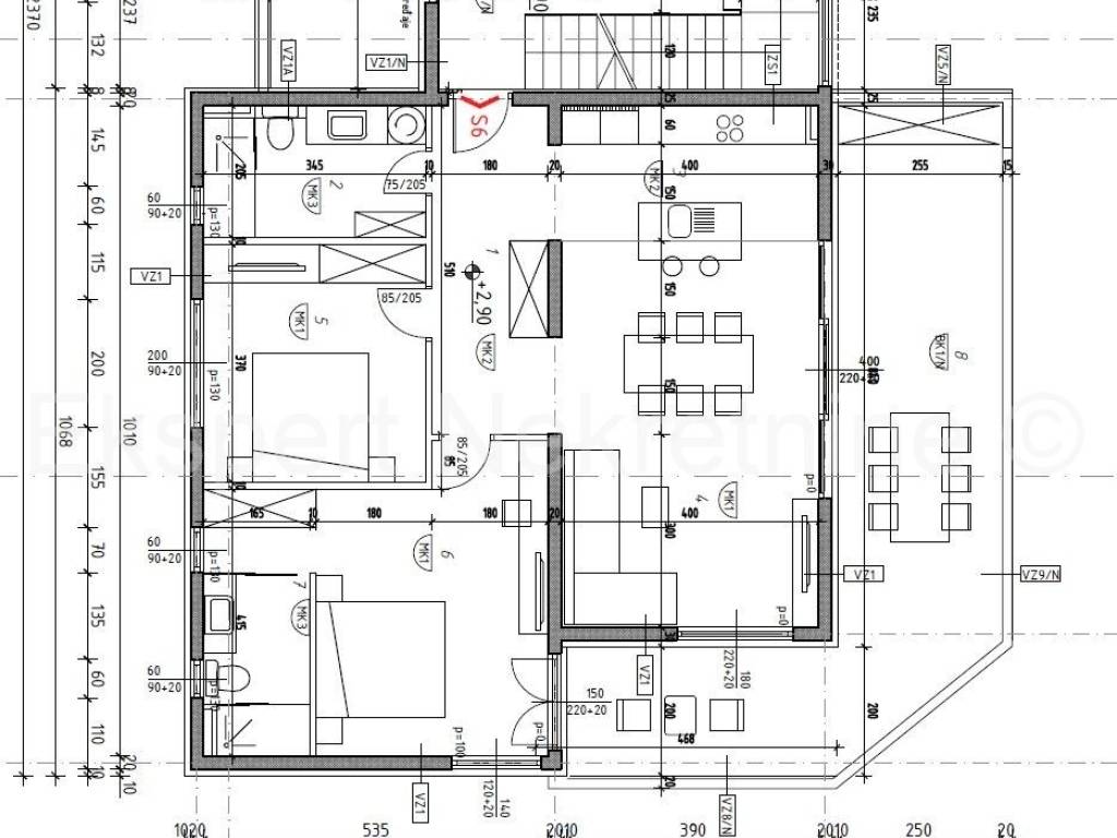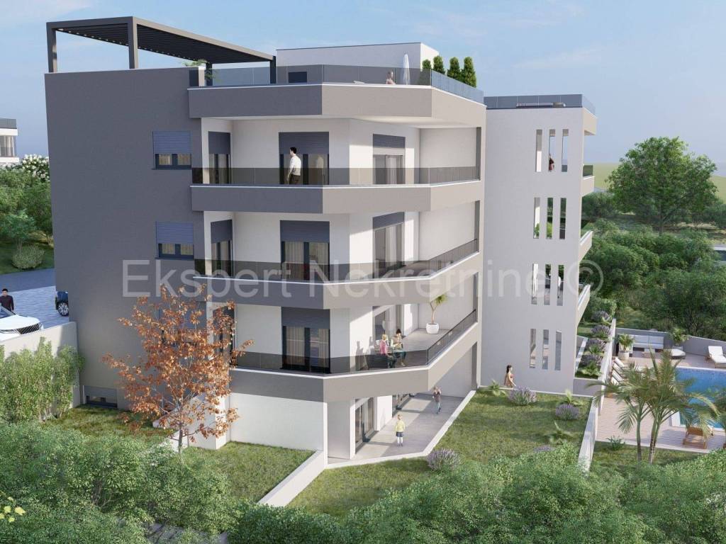 Split, Čiovo, Slatine, near the beach, comfortable two-bedroom apartment 113 m2 (82 m2 apartment plus 32 m2 terrace) in a new building with a shared swimming pool. The apartment is located on the high ground floor, oriented north-east-south, and consists of two large bedrooms, two bathrooms, hallway, kitchen with dining room and large living room, and a large terrace (32 m2) with a view of the sea. The apartment is only 220 m from the sea and the beach. The apartment also has two outdoor parking spaces. Construction has begun, and completion is scheduled for summer 2026. Quality construction (underfloor heating throughout the apartment, air conditioning in each room, quality ceramics and sanitary ware, etc.). Possibility of choosing the equipment of your own choice. Quiet location near the beautiful beach and the town center. Payment by construction phases. For more info, contact the agency.