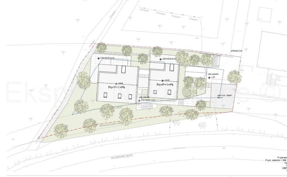Propisana udaljenost građevine od međe iznosi 4,0 m, regulacijska linija - udaljenost od osi državne ceste 9,0 m, te neto površina koja ostaje za građenje iznosi 839,00 m2. KiG=0,3, što dopušta maksimalnu tlocrtnu izgrađenost od 200,00 m2.