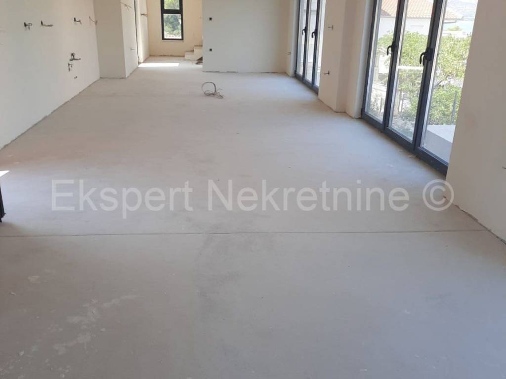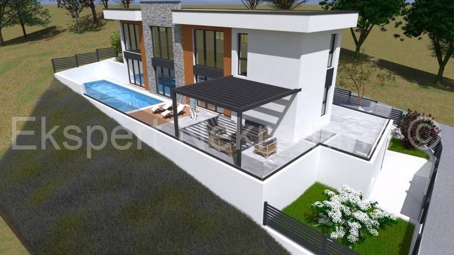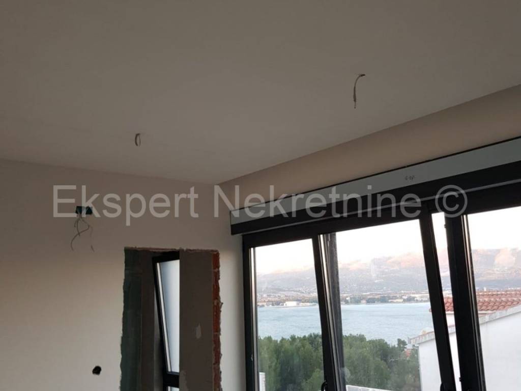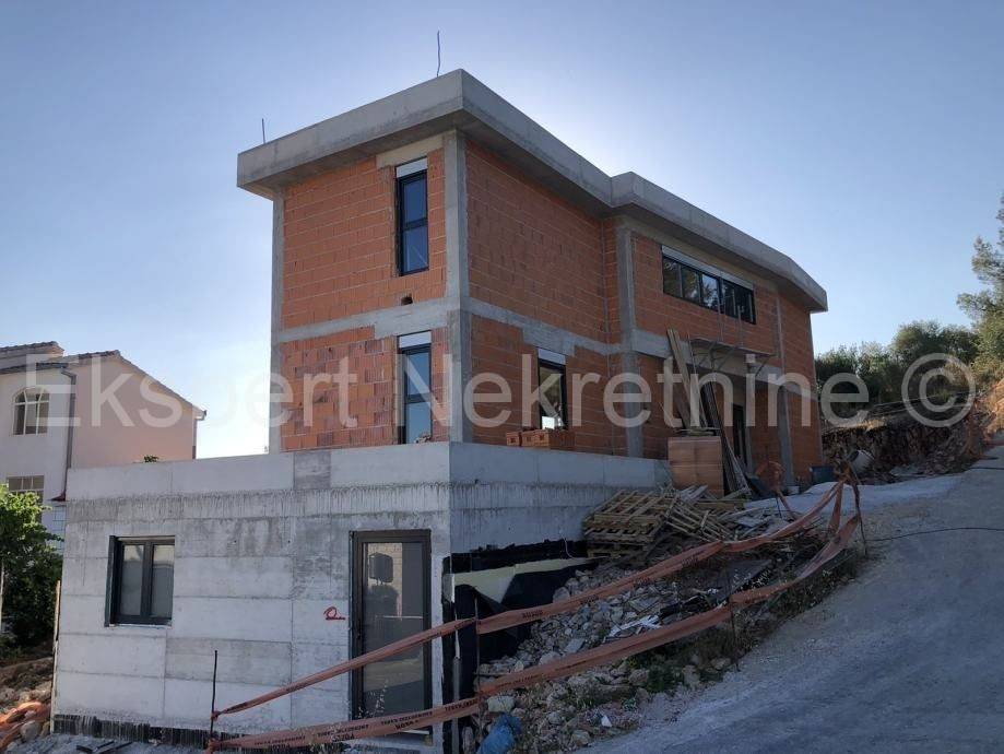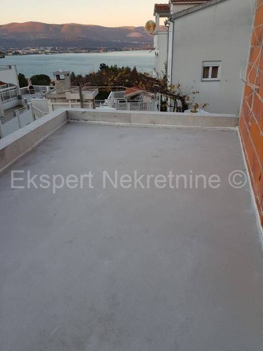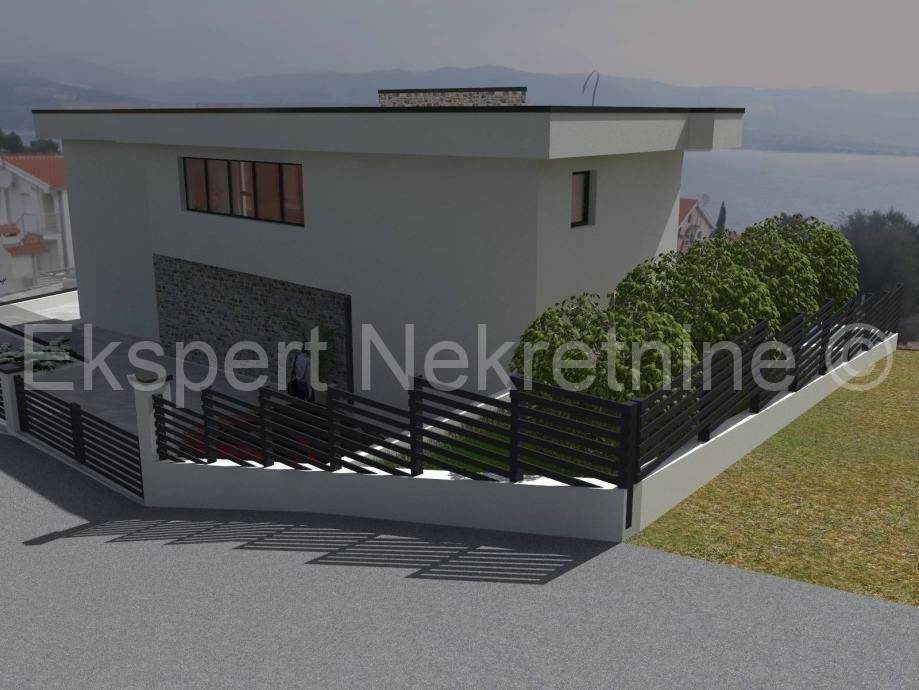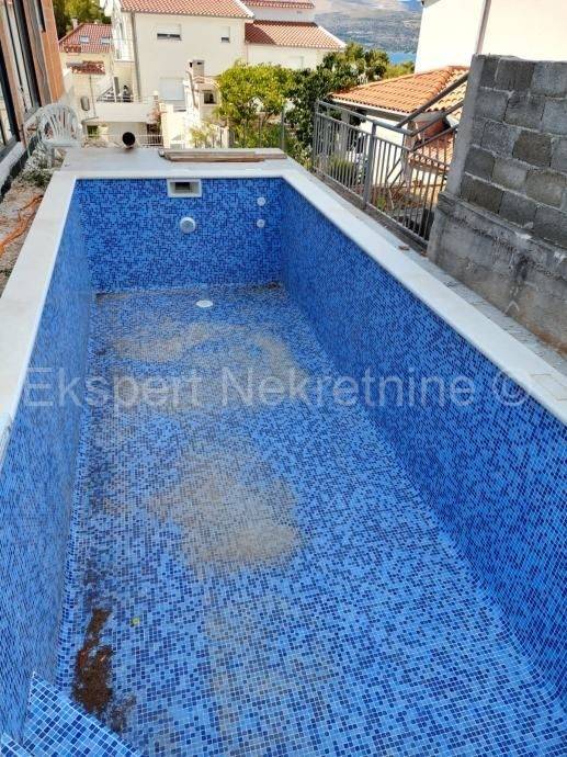 Čiovo, Slatine, modern villa with sea view and swimming pool positioned in an attractive location in Čiovo, 270 mdistance from the sea. The property with a living area of 233 m2 is positioned on a plot of land of 400 m2 and consists of a basement,ground floor and first floor. The basement floor of 45 m2 has a sauna, hydromassage bath, walk-in shower and toilet. Above this floor there are two terraces, a smaller terrace of 23 m2 and a roof terrace of 107 m2 from whichimpressive sea view. The ground floor of 93 m2 consists of an open concept kitchen with dining room and living room and a bathroom. An internal staircase leads to the first floor of 95 m2 where there are three bedrooms with private bathrooms. The outdoor part is enriched with a swimming pool with a sunbathing area and a covered part with a pergola where the outdoor area is locateddining room. It has a parking space.An attractive offer is the location, which is within walking distance of the beach, 10 minutes' drive from Trogir, and45 minutes from Split.