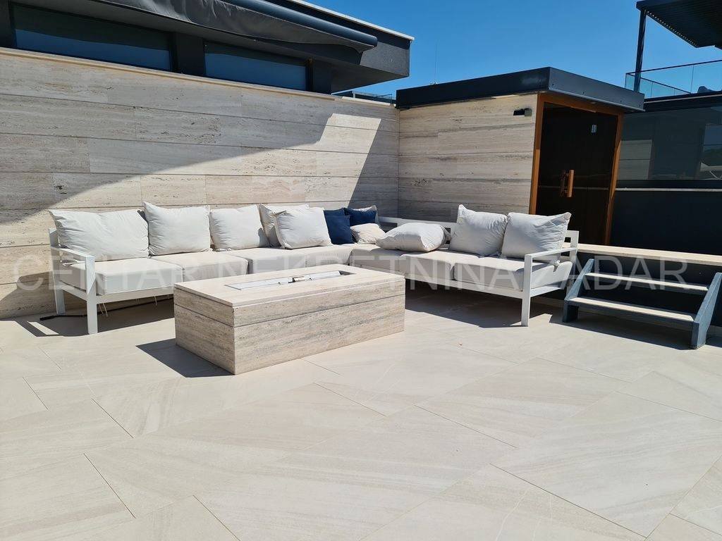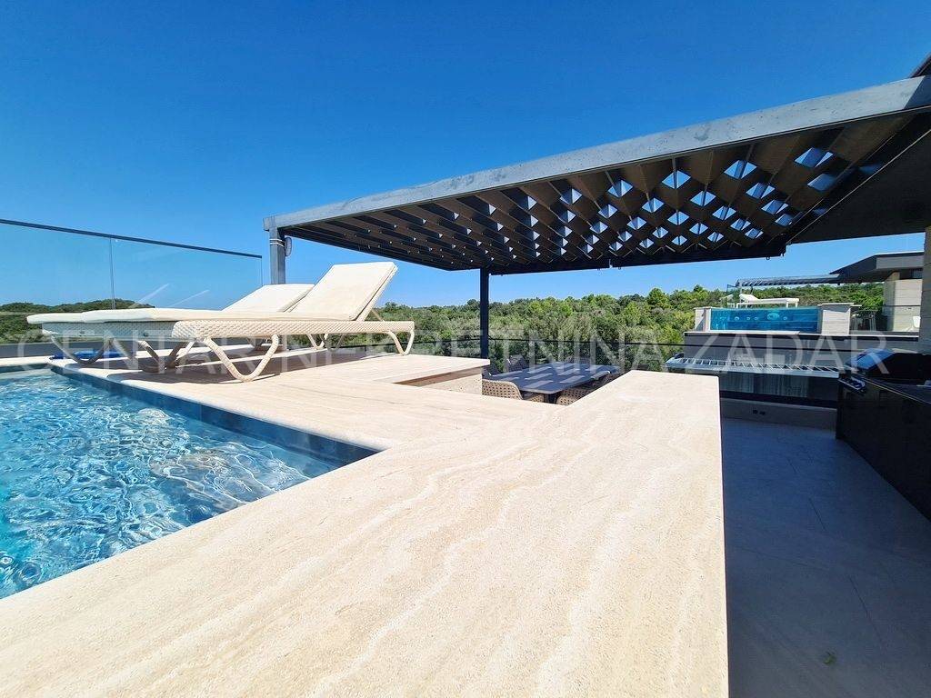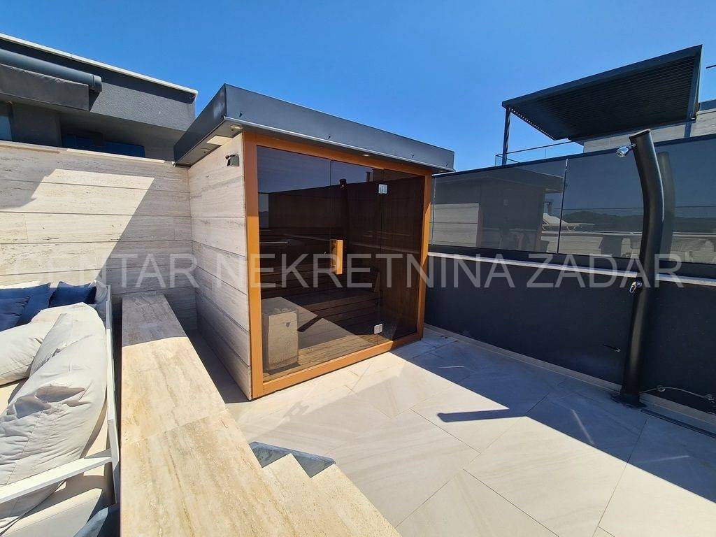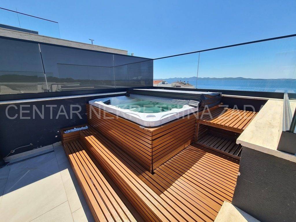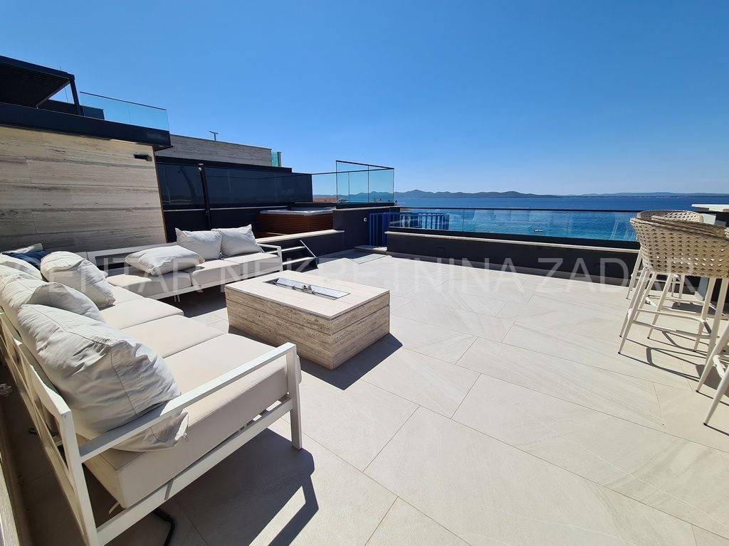 Posebnost stana je velika krovna terasa na koju se može pristupiti spiralnim stepenicama s terase stana ili preko stubišta zgrade. Terasa je potpuno opremljena za ugodan boravak više osoba koji iz svakog dijela mogu uživati u panoramskom pogledu na more i otoke. Na terasi su grijani bazen od oko 33 m sa sunčalištem, sauna, jacuzzi, tuš te velika garnitura za sjedenje. Na dijelu natkrivenom pergolom nalazi se stol za objedovanje i vanjska kuhinja. Ukupna tlocrtna površina stana zajedno s krovnom terasom i pripatcima iznosi 327,17 m.