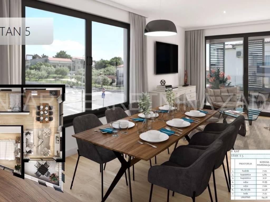 The two-bedroom apartment S5 on the second floor has a floor area of 69.78 m (net 67.94 m) and consists of a hallway, kitchen with dining area and living room (24.58 m), two bedrooms, two bathrooms and a loggia (7.35 m). The apartment has two garage parking spaces, so the total usable area of the apartment with its accessories is 81.70 m.