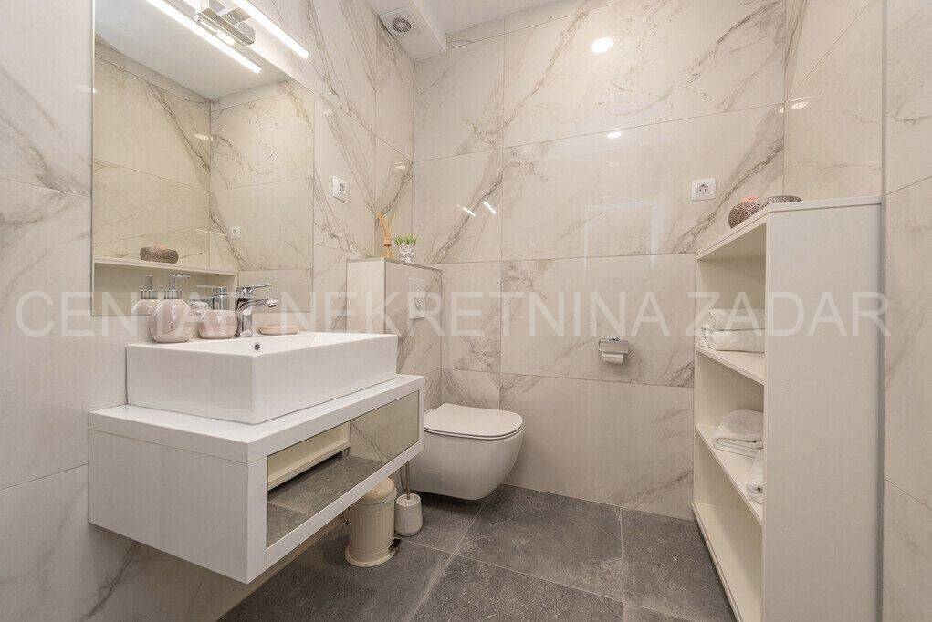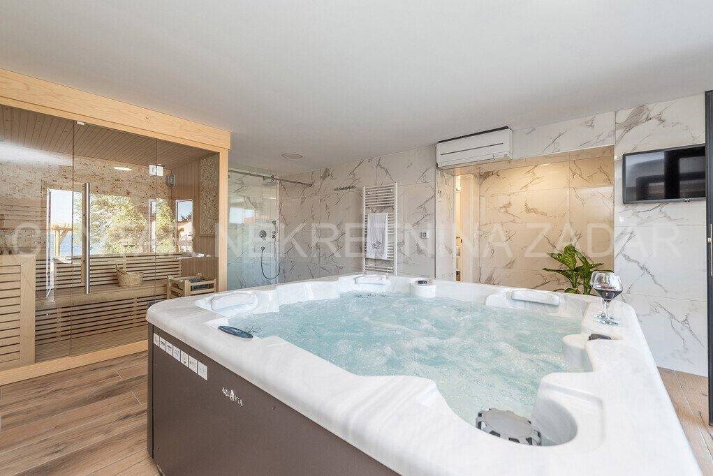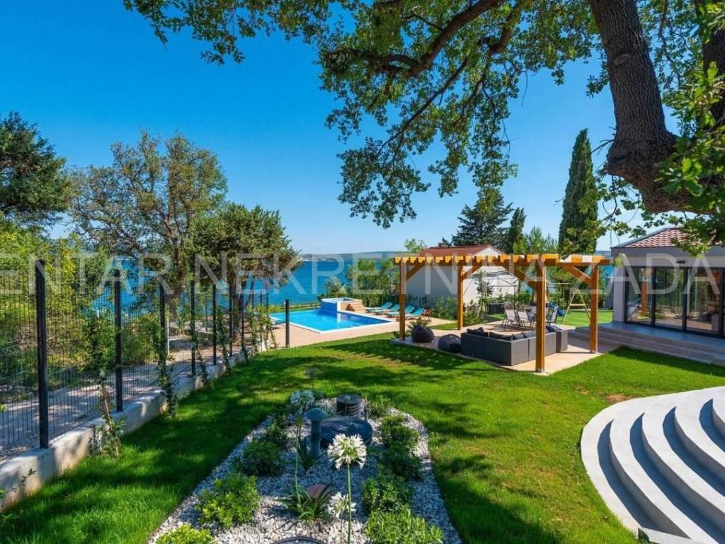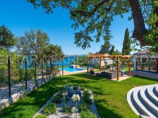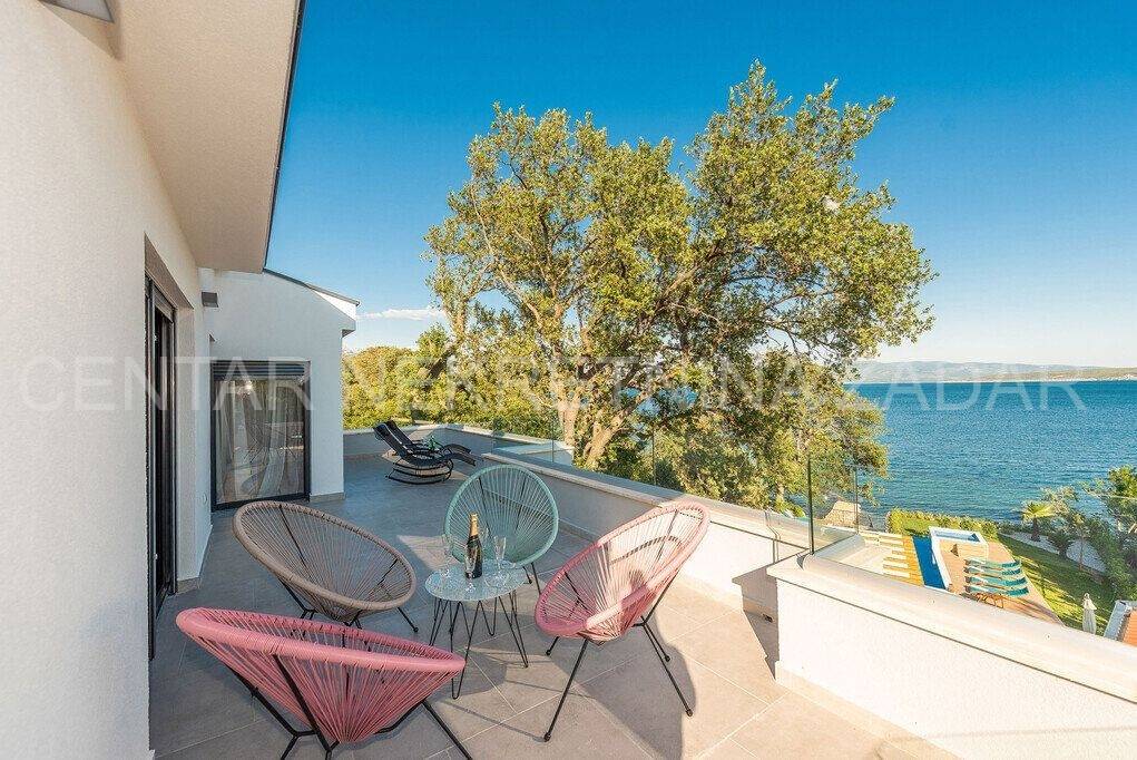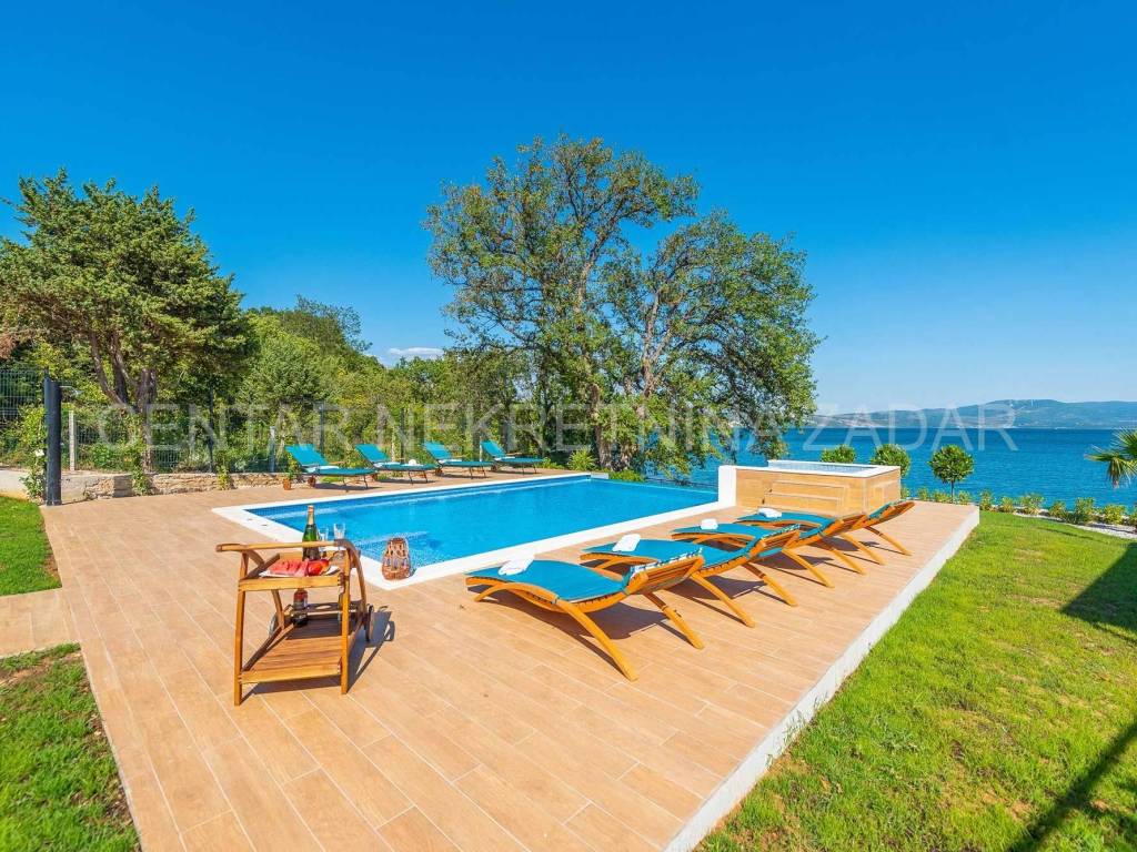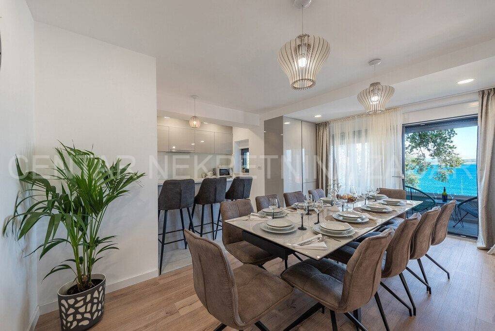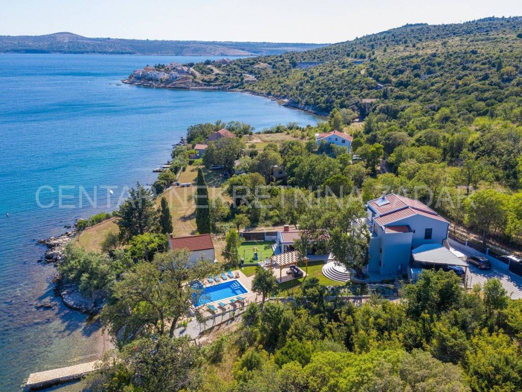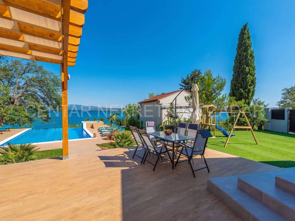 Aunique villa for sale in the first row to the sea, in a special location, surrounded by nature and the sea.The villa itself has 320m2 of living space, and the entire property covers a total of 1068 m2. It was completely renovated in 2019. It consists of ground floor, first and second floor, with a total of five bedrooms with private bathrooms. On the first floor is a large open space kitchen connected to the dining room and living room, open glass walls which offers a beautiful view of the courtyard and open sea views. There are two bedrooms on the same floorUpstairs are the remaining bedrooms with bathrooms. The wellness center, located on the first floor of the house, is perfectly designed because the sauna and jacuzzi offer a view of the outdoor pool and the sea. For sports lovers, the villa also contains a recreation area with fitness equipment.In the courtyard of the villa, next to the pool and veranda where there is an outdoor table, there is a summer kitchen dissolved by glass sliding walls and is intended for indoor use in winter and semi-open for warmer weather. In addition to the kitchen, there is also a large fireplace and billiards and darts for relaxation and entertainment, while the open fire of the fireplace in the preparation of Mediterranean gastronomic delicacies. Next to the summer kitchen there is a children's playground with a slide and swing. In the middle of the large yard of this villa is an infinity pool that has a heating function, while the direct entrance to the sea is only 20 m away.Each room is equipped with inverter air conditioning, and in the living room there is a glazed fireplace for a better atmosphere in winter. There is a modern bioseparator in the yard and the by-product is used for the purpose of irrigating the yard.The villa with its modern facilities is located in an idyllic natural setting.