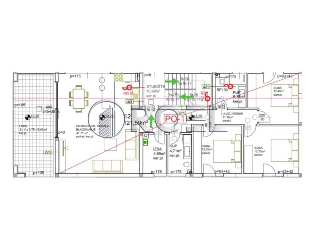 Four-room apartment on the first floor of a new two-story building, NKP 121.59 m2, located in a quiet street. It consists of an entrance hall (11.16 m2), living room, kitchen and dining room (41.71 m2) with access to a terrace of 21.11 m2 (15.83 m2), pantry (4.65 m2), toilet (4.71 m2), three bedrooms (12 m2, 13.70 m2 and 12.48 m2) and a bathroom with toilet (5.35 m2).The primary source of energy for heating residential buildings is electricity, heating is provided by air-to-air heat pumps installed in every room in the apartment. As a secondary source of energy and an additional heating system, hot water radiator heating with connection to a gas condensing boiler will be installed for all rooms in each apartment. The same condensing boiler is also used to prepare hot water for consumption.The apartment will have PVC furniture, security doors, air conditioning and a video intercom. The floors in the apartment will be covered with parquet and ceramics.