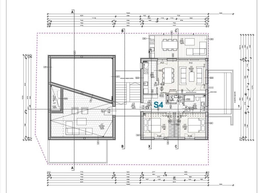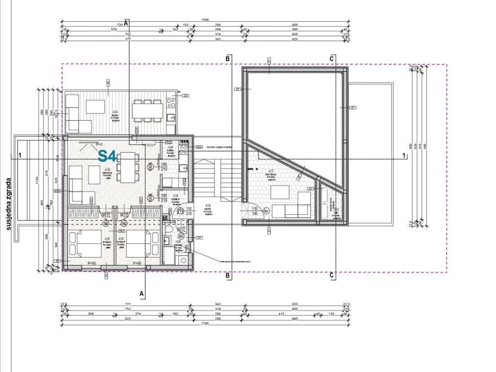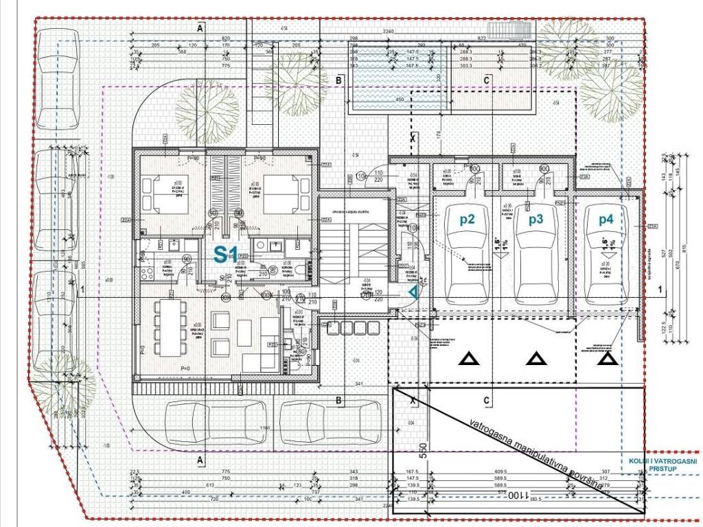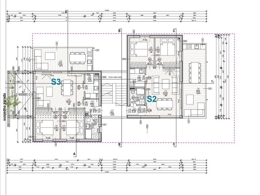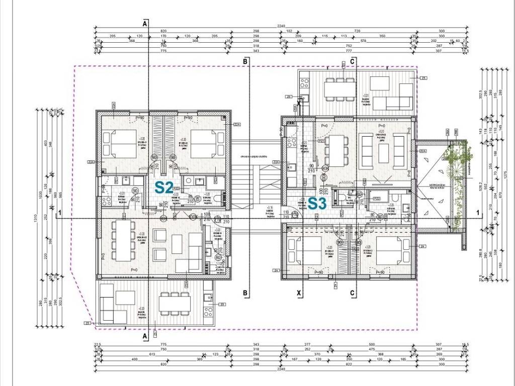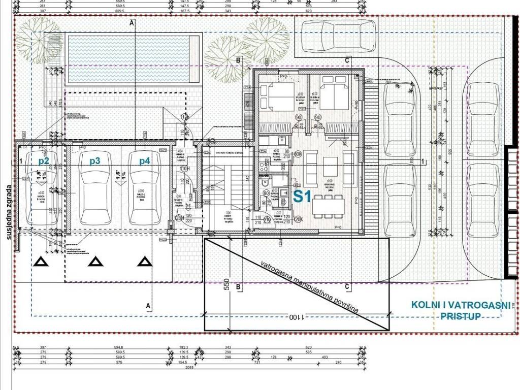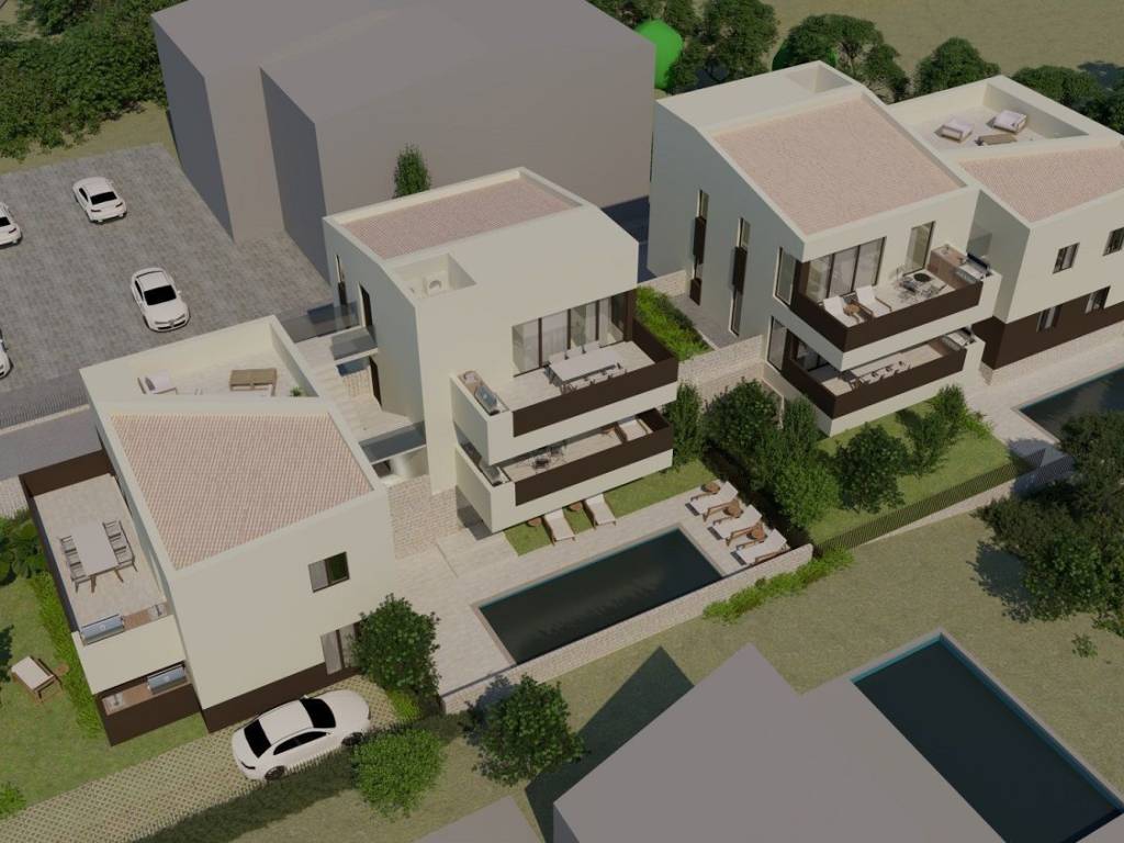 Projekt se sastoji od dvije zgrade, prva zgrada ima 4 stana, svaki otprilike 55m2, stanovi imaju terase od 23m2 ili 18m2, s tim da stan br.4 ima i krovnu terasu. Druga zgrada ima 4 stana po cca.67m2, sa terasama od 18m2. Svaka zgrada ima podrume sa ostavama, garaže za tri automobila, svaki stan ima po 2 parkirna mjesta.Prva zgrada ima ukupno 317,99m2 natkriveni prostor i 144,09m2 otkriveni prostor, bazen 26,24m2Druga zgrada ukupno 392,56m2 natkriveni prostor i 154,13m2 otkriveni prostor, bazen 26,24m2