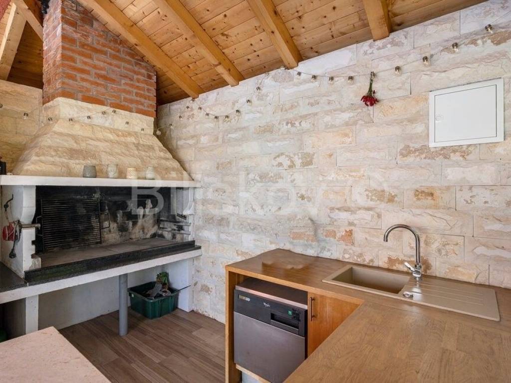 To complete the outdoor idyll, there is also a summer kitchen with a built-in barbecue, and a spacious table for pleasant gatherings. There is also a jacuzzi nearby.