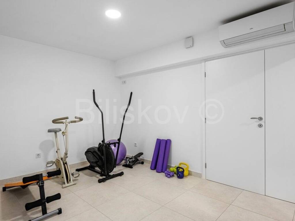 The villa consists of a residential unit in the basement/ground floor. It is a comfortable one-room apartment: spacious living room, kitchen, bedroom, bathroom, laundry room, fitness area and a paved terrace connected to the outdoor area: sunbathing area, swimming pool and jacuzzi.