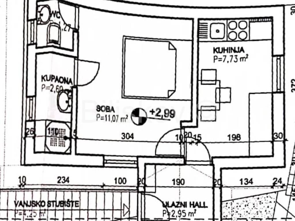 The apartment on the ground floor consists of a kitchen, a room, a toilet, a pantry, and a covered terrace. Total 31, 71 m2.