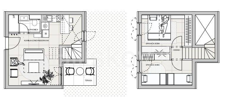 Stan je dvoetažan i nalazi se na prvom katu i mansardizgrade, 100ak metara od mora. Sastoji se od kuhinje sa blagavaonicom tejedne sobe, toaleta i terase.
