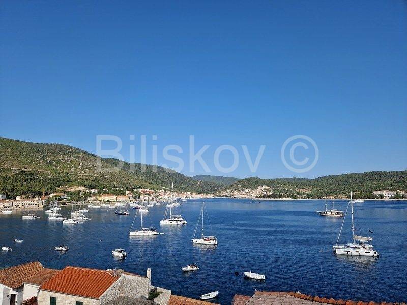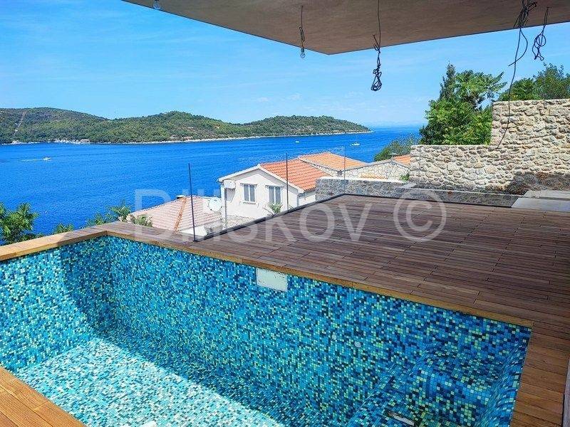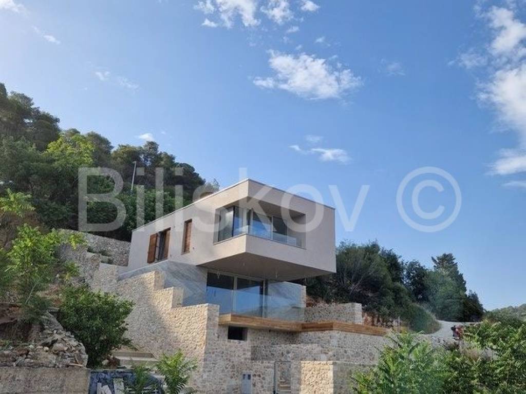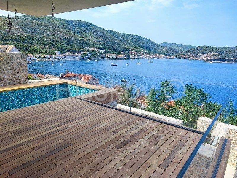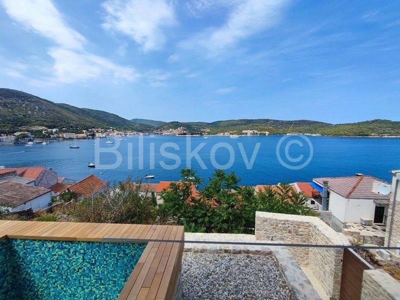 Vis, modern luxury villa with pool and open sea view.The newly built villa has an area of 172m2 and is located on a plot of 226m2.The villa consists of a ground floor on which there is a kitchen, dining room, living room, terrace and bathroom.On the 1st floor there are two luxurious bedrooms, each with its own bathroom. Quality materials were used in the construction, such as high-quality parquet, tiles, all sanitary ware and teak around the pool.Possibility of upgrading.Arranged and cultivated garden. www.biliskov.com ID: 13042-1