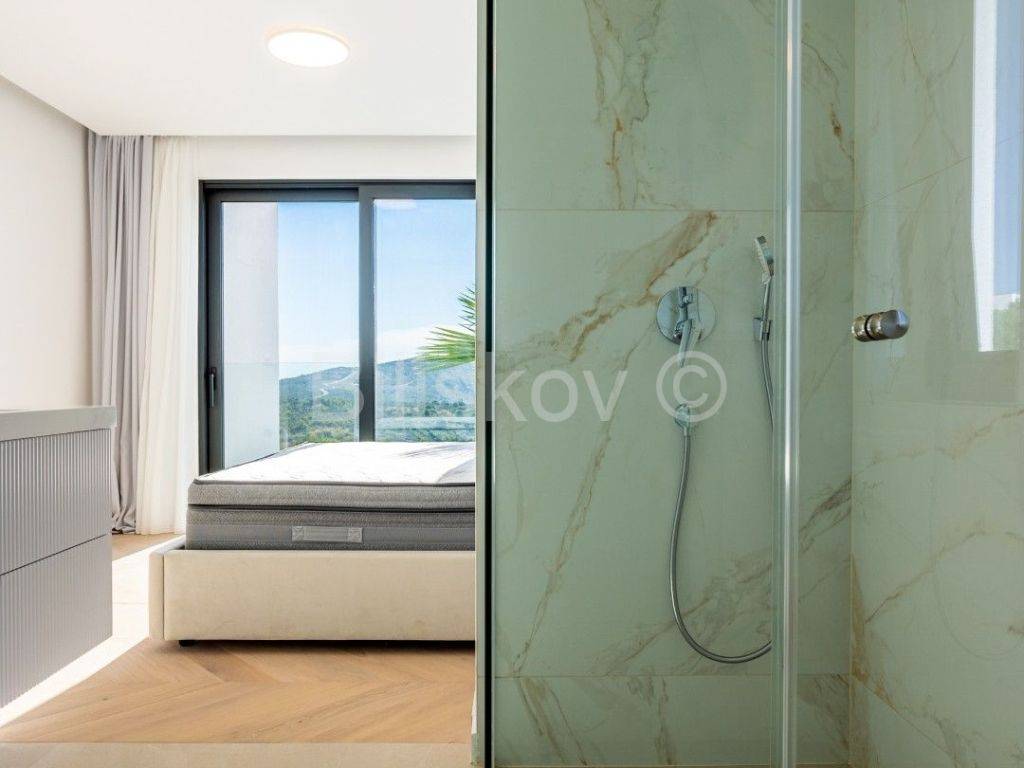 Internal stairs leading to the lower level and impressive views of the Primošten archipelago lead to the upper floor, which consists of a luxurious master bedroom with its own bathroom and dressing room. The room also has direct access to the spa area (sauna and jacuzzi), from which there is a mesmerizing view of the sea, which makes this part of the villa one of its greatest attractions. On the same floor there is another bedroom with a private bathroom and dressing room.