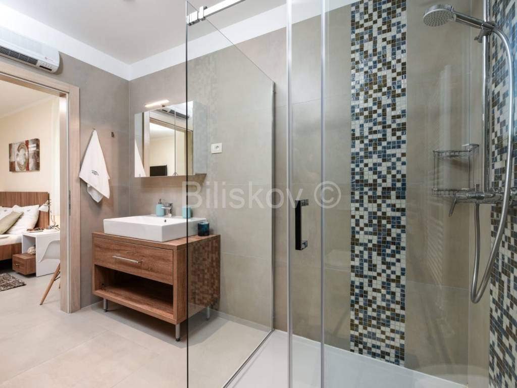 Prizemlje komforan dnevni boravak, kuhinja s blagovaonicom, spavaća soba s kupaonicom, zasebni wc, natkriveni balkon