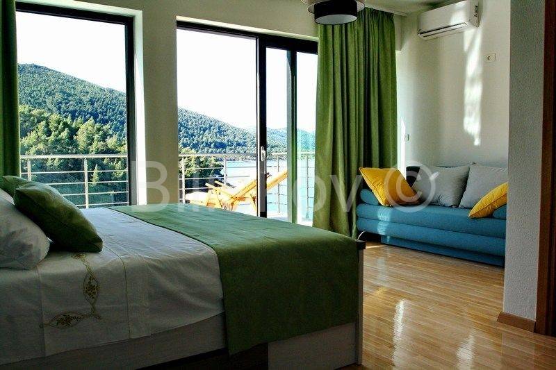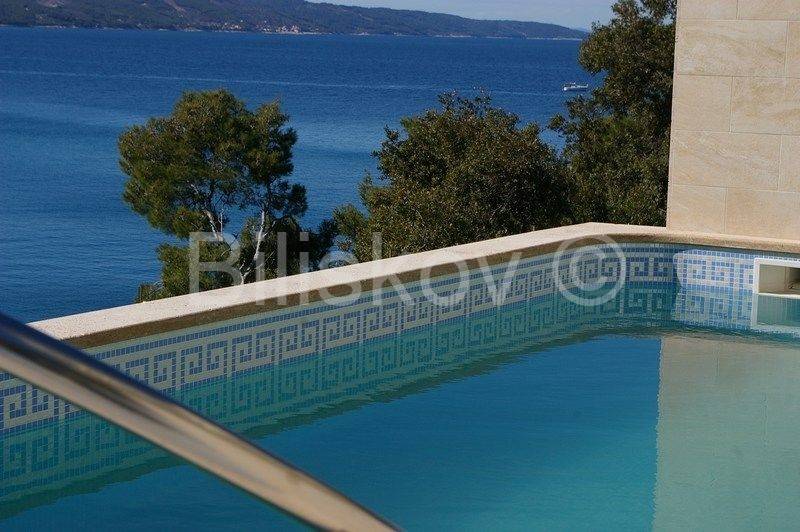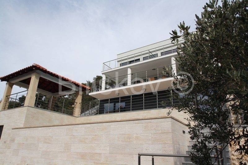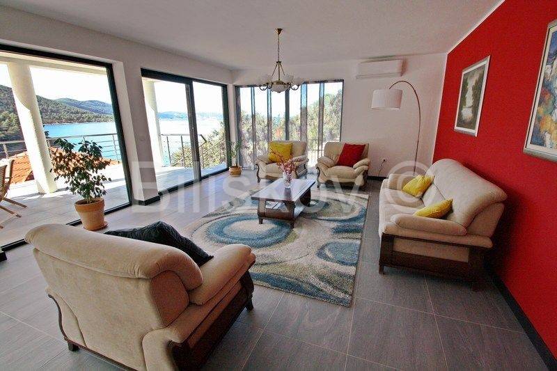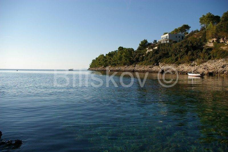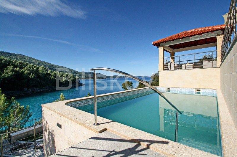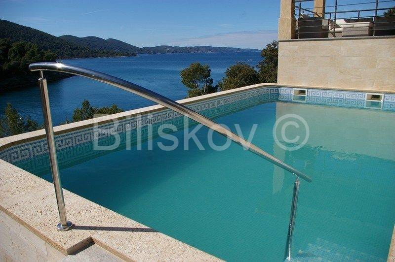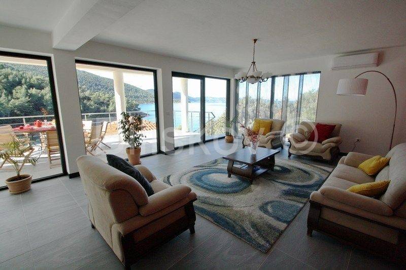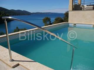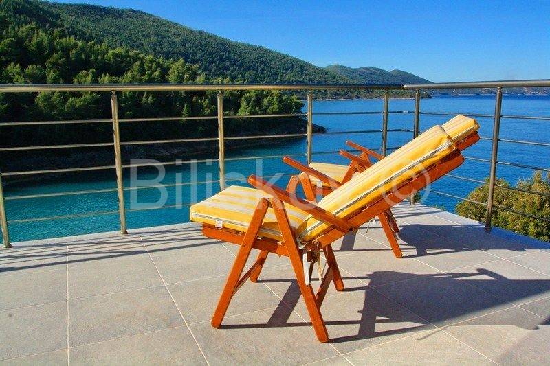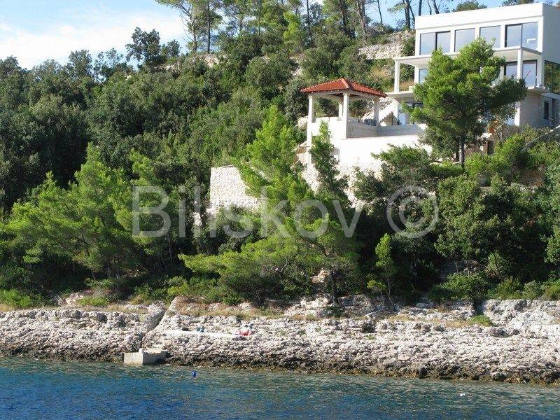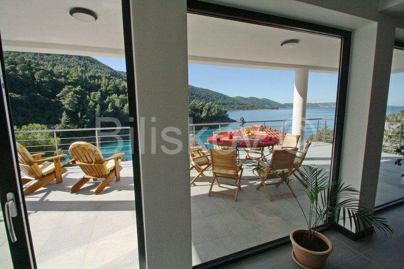 KORCULA, NORTH SIDE- newly built modern villa with pool in the first row to the sea with a berth for a boat. The living area of the villa is 289m2, and it was built on a plot of 748m2. On the ground floor there is a living room with bathroom, total area of 45m2 which is designed as an auxiliary living room while staying by the pool, and in front is a sunbathing plateau, a large terrace with gazebo and pool. On the high ground floor of 94m2 there is a kitchen with dining area, living room separated by a glass wall from a large terrace of 47m2, bathroom and pantry. On the 1st floor of 150m2 there is a spacious entrance hall and 4 bedrooms, each with bathroom. The villa is extremely well built, and equipped with quality furniture and appliances. The position provides complete privacy and is located in a quiet bay. www.bilskov.com ID 8568