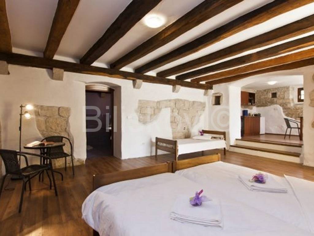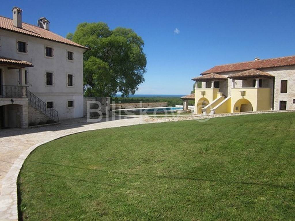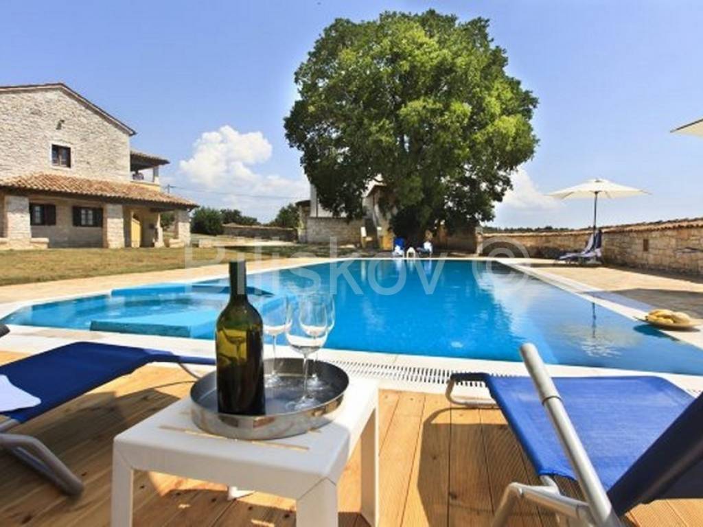 Two luxuriously decorated and equipped villas with a total living area of 850 m2 on a plot of 3030 m2 surrounded by a stone Istrian wall with 2 separate entrances to the property. The villas are located in the heart of Istria, 8 km from the sea, surrounded by vineyards.