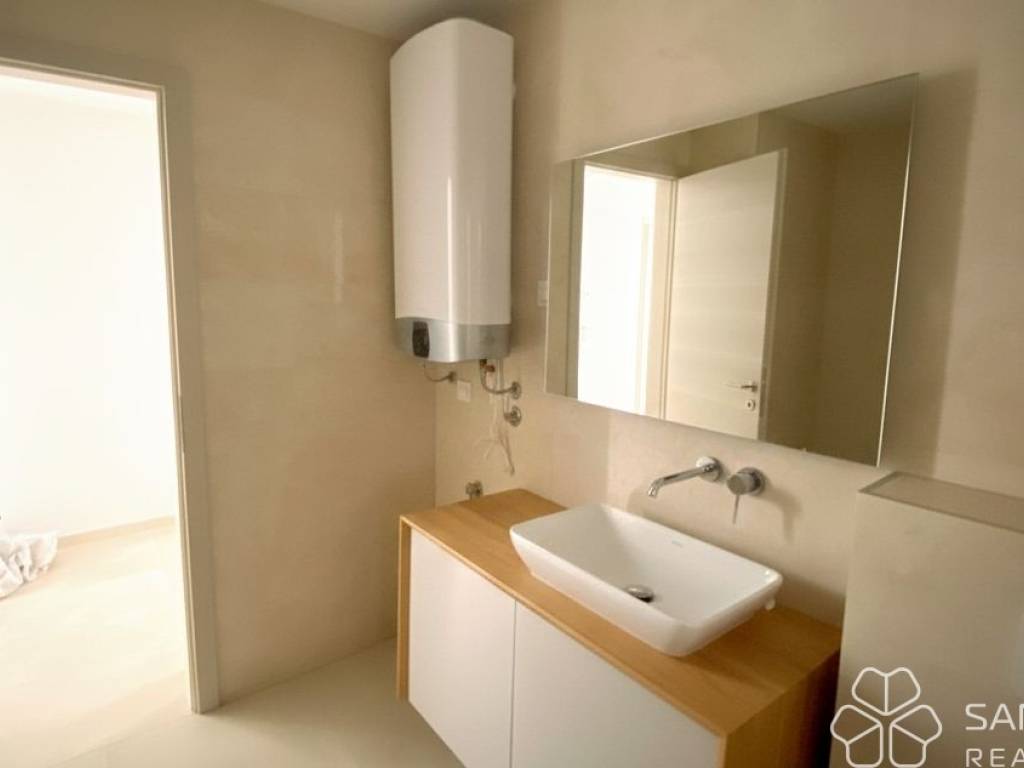 The apartment of 60.80 m consists of an entrance hall, two bedrooms, a luxurious bathroom and a living room with a kitchen and dining area, which opens onto a covered terrace of 13.38 m with a beautiful view of the sea, Crikvenica and the island of Krk. The apartment has a garden of 133.92 m, a storage room of 3.75 m in the basement and the use of a shared swimming pool with a sunbathing area. The price includes a garage parking space.