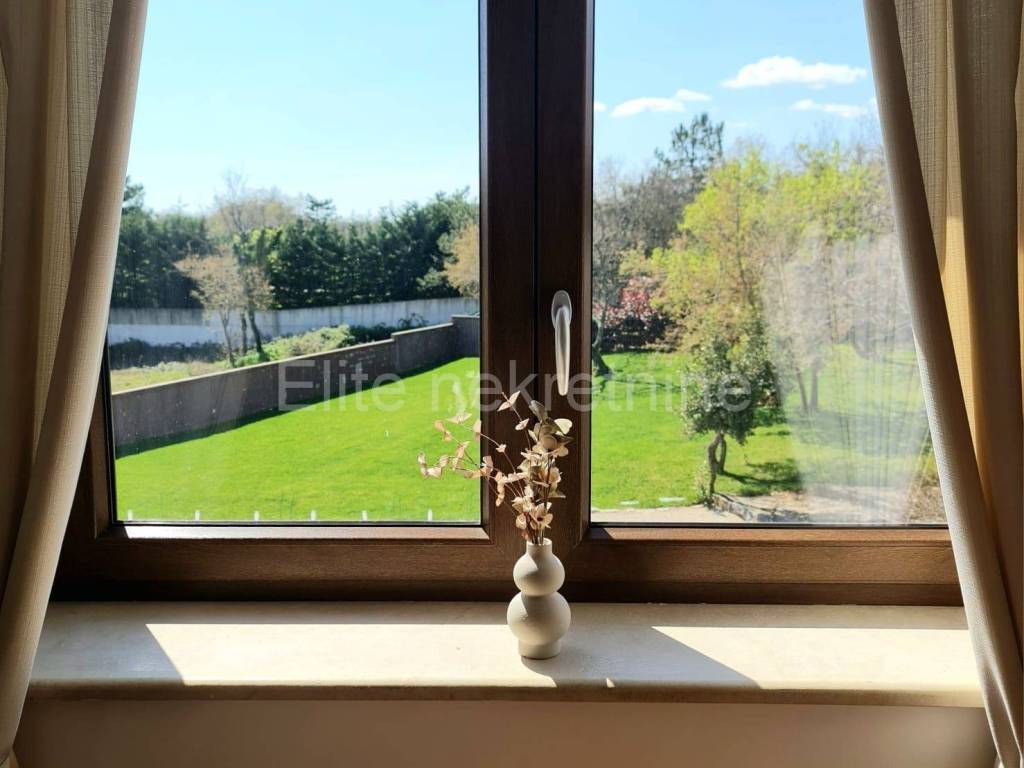 Eksterijer:Iz dnevnog boravka i blagovaonice izlazi se na prostranu terasu koja vodi u uređeni vrt s bazenom površine 32 m i sunčalištem. Predviđen je i prostor za izgradnju roštilja, a u produžetku je postavljena konstrukcija koja trenutno služi kao vanjska ostava, no lako se može prenamijeniti u wellness zonu s jacuzzijem i saunom.
