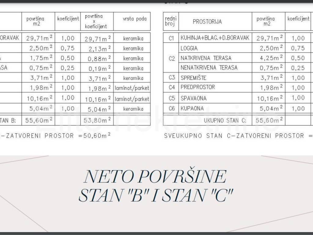 The apartment in question "B" is 55.60 m2 in size, of which the terrace is 2.50 m2 and the loggia is 2.50 m2. The apartment has a storage room in the basement of 8.60 m2.