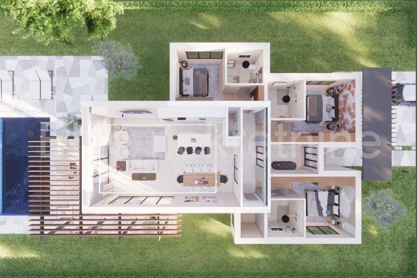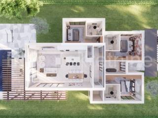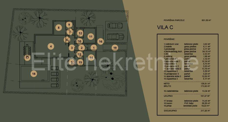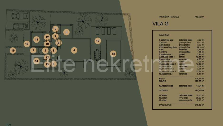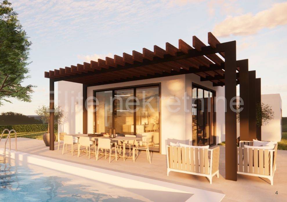 Svaka kuća u projektu je površine oko 170m2 s terasama i sastoji se od 3 spavaće sobe, 3 kupaonice, wc-om, open space kuhinjom sa dnevnim boravkom i bazenom. Veličine parcela variraju 750-1000m2.