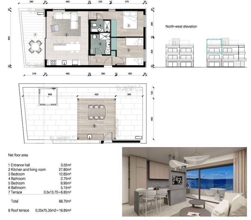Impozantnu krovnu terasu koja se proteže preko cijelog apartmana — vaša privatna vanjska oaza s nevjerojatnim pogledom od 360 stupnjeva. Terasa je unaprijed projektirana za vanjsku kuhinju i jacuzzi, savršena za ljetne večeri, večere pod otvorenim nebom ili jednostavno uživanje u piću i zalasku sunca