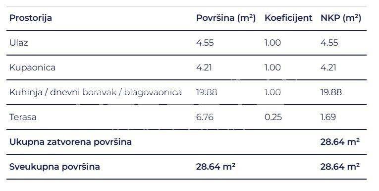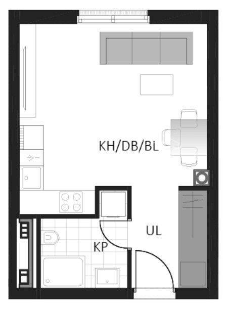 Prostrani jednosobni stan sastoji se od kupaonice, hodnika, dnevnog boravka s kuhinjom i blagovaonicom.