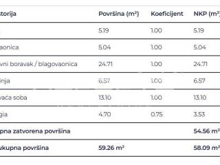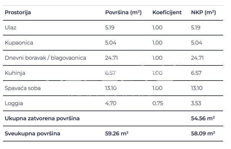 Prostrani dvosobni stan sastoji se od spavaće sobe, kupaonice, hodnika, dnevni boravak s kuhinjom i blagovaonicom te loggie.